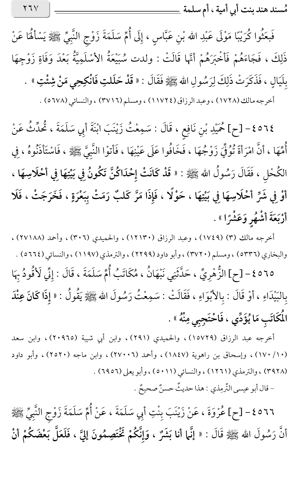 أخرجه عبد الرزاق (١٥٧٢٩)، والحميدي (٢٩١)، وابن أبي شيبة (٢٠٩٦٥)، وابن سعد (١٠/ ١٧٠)، وإسحاق بن راهوية (١٨٤٧)، وأحمد (٢٧٠٠٦)، وابن ماجة (٢٥٢٠)، وأبو داود (٣٩٢٨)، والترمذي (١٢٦١)، والنسائي (٥٠١١)، وأبو يعلى (٦٩٥٦).