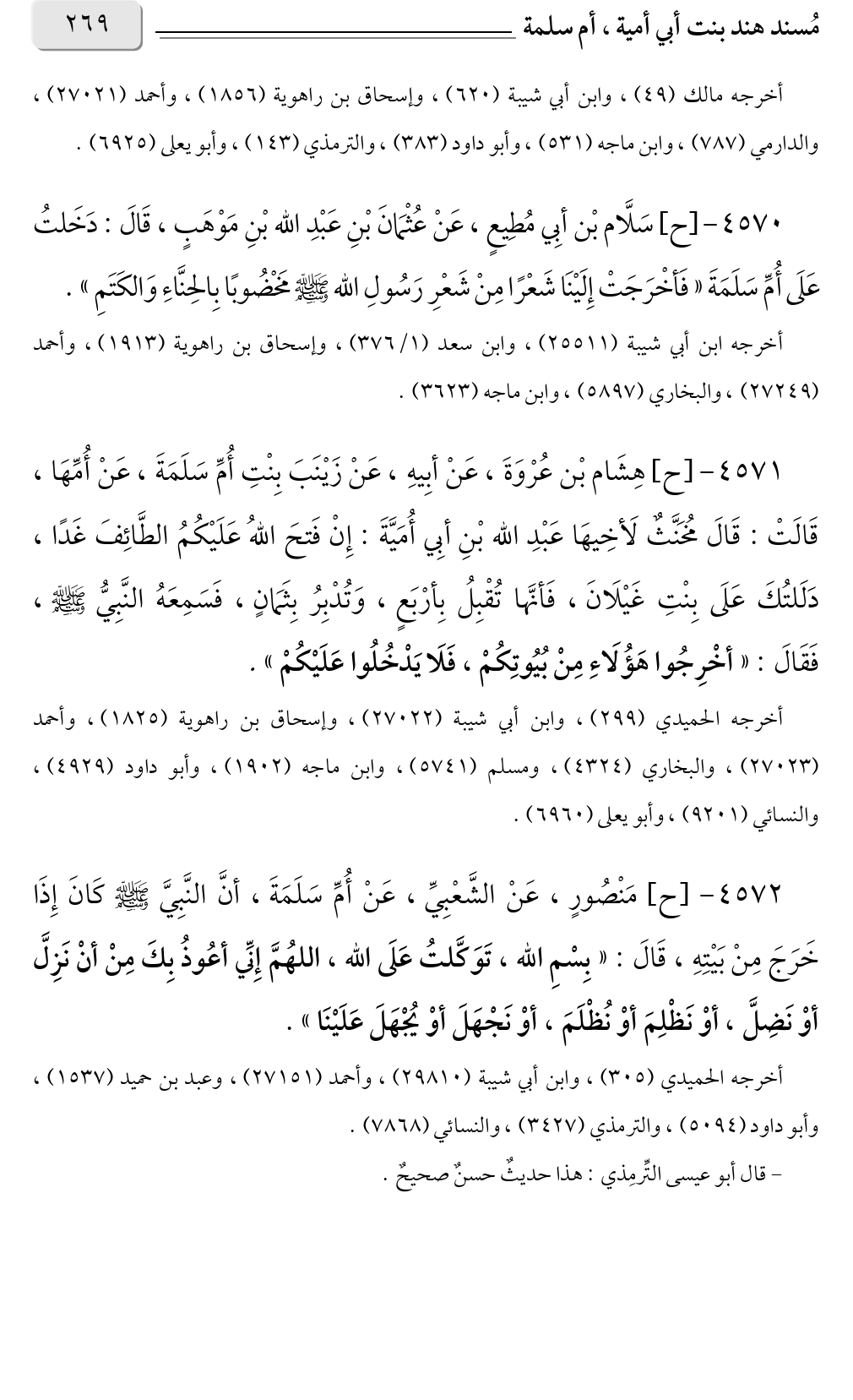 ٤٥٧٢ - [ح] مَنْصُورٍ، عَنْ الشَّعْبِيِّ، عَنْ أُمِّ سَلَمَةَ، أنَّ النَّبِيَّ صلى الله عليه وسلم كَانَ إِذَا خَرَجَ مِنْ بَيْتِهِ، قَالَ: «بِسْمِ الله، تَوَكَّلتُ عَلَى الله، اللهُمَّ إِنِّي أعُوذُ بِكَ مِنْ أنْ نَزِلَّ أوْ نَضِلَّ، أوْ نَظْلِمَ أوْ نُظْلَمَ، أوْ نَجْهَلَ أوْ يُجْهَلَ عَلَيْنَا».