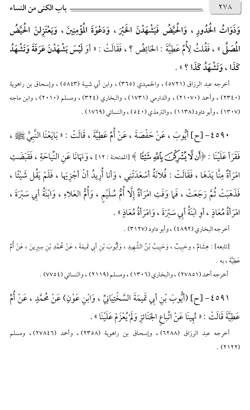 ٤٥٩١ - [ح] (أيُّوبَ بْنِ أبِي تَميمَةَ السَّخْتِيَانِيِّ، وَابْنِ عَوْنٍ) عَنْ مُحمَّدٍ، عَنْ أُمِّ عَطِيَّةَ قَالَتْ: «نُهِينَا عَنْ اتِّباعِ الجَنَائزِ وَلَمْ يُعْزَمْ عَلَيْنَا».