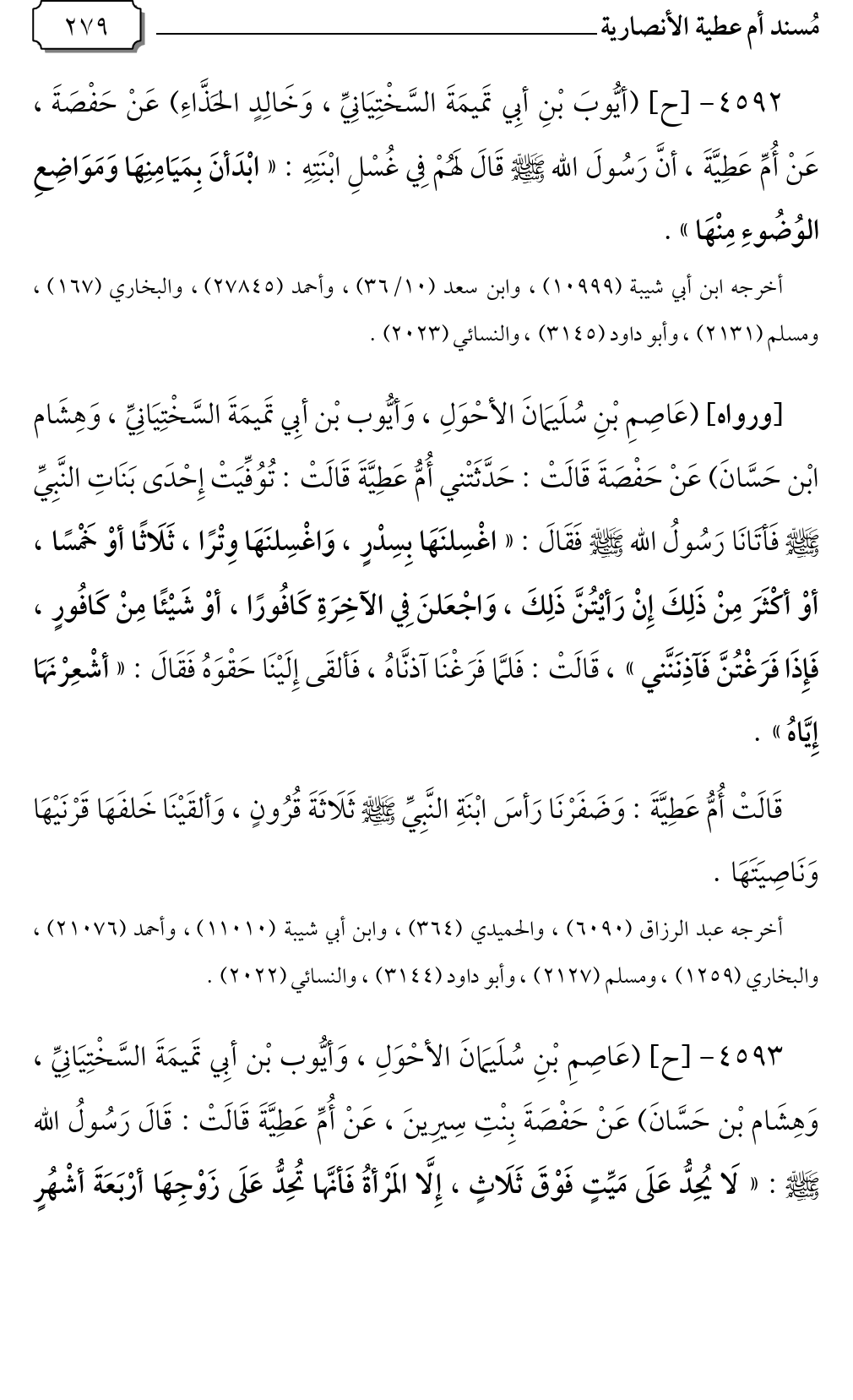 ٤٥٩٣ - [ح] (عَاصِمِ بْنِ سُلَيمَانَ الأحْوَلِ، وَأيُّوب بْن أبِي تَميمَةَ السَّخْتِيَانِيِّ، وَهِشَام بْن حَسَّانَ) عَنْ حَفْصَةَ بِنْتِ سِيرِينَ، عَنْ أُمِّ عَطِيَّةَ قَالَتْ: قَالَ رَسُولُ الله صلى الله عليه وسلم: «لَا يُحِدُّ عَلَى مَيِّتٍ فَوْقَ ثَلَاثٍ، إِلَّا المَرْأةُ فَأنَّها تُحِدُّ عَلَى زَوْجِهَا أرْبَعَةَ أشْهُرٍ
