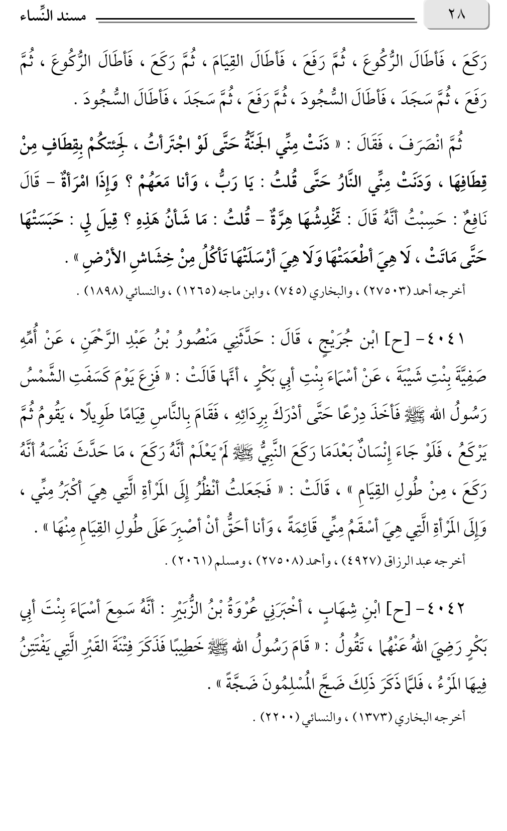 ٤٠٤١ - [ح] ابْن جُرَيْجٍ، قَالَ: حَدَّثَنِي مَنْصُورُ بْنُ عَبْدِ الرَّحْمَنِ، عَنْ أُمِّهِ صَفِيَّةَ بِنْتِ شَيْبَةَ، عَنْ أسْمَاءَ بِنْتِ أبِي بَكْرٍ، أنَّها قَالَتْ: «فَزِعَ يَوْمَ كَسَفَتِ الشَّمْسُ رَسُولُ الله صلى الله عليه وسلم فَأخَذَ دِرْعًا حَتَّى أدْرَكَ بِرِدَائِهِ، فَقَامَ بِالنَّاسِ قِيَامًا طَوِيلًا، يَقُومُ ثُمَّ يَرْكَعُ، فَلَوْ جَاءَ إِنْسَانٌ بَعْدَمَا رَكَعَ النَّبِيُّ صلى الله عليه وسلم لَمْ يَعْلَمْ أنَّهُ رَكَعَ، مَا حَدَّثَ نَفْسَهُ أنَّهُ رَكَعَ، مِنْ طُولِ القِيَامِ» قَالَتْ: «فَجَعَلتُ أنْظُرُ إِلَى المَرْأةِ الَّتِي هِيَ أكْبَرُ مِنِّي، وَإِلَى المَرْأةِ الَّتِي هِيَ أسْقَمُ مِنِّي قَائِمَةً، وَأنا أحَقُّ أنْ أصْبِرَ عَلَى طُولِ القِيَامِ مِنْهَا».