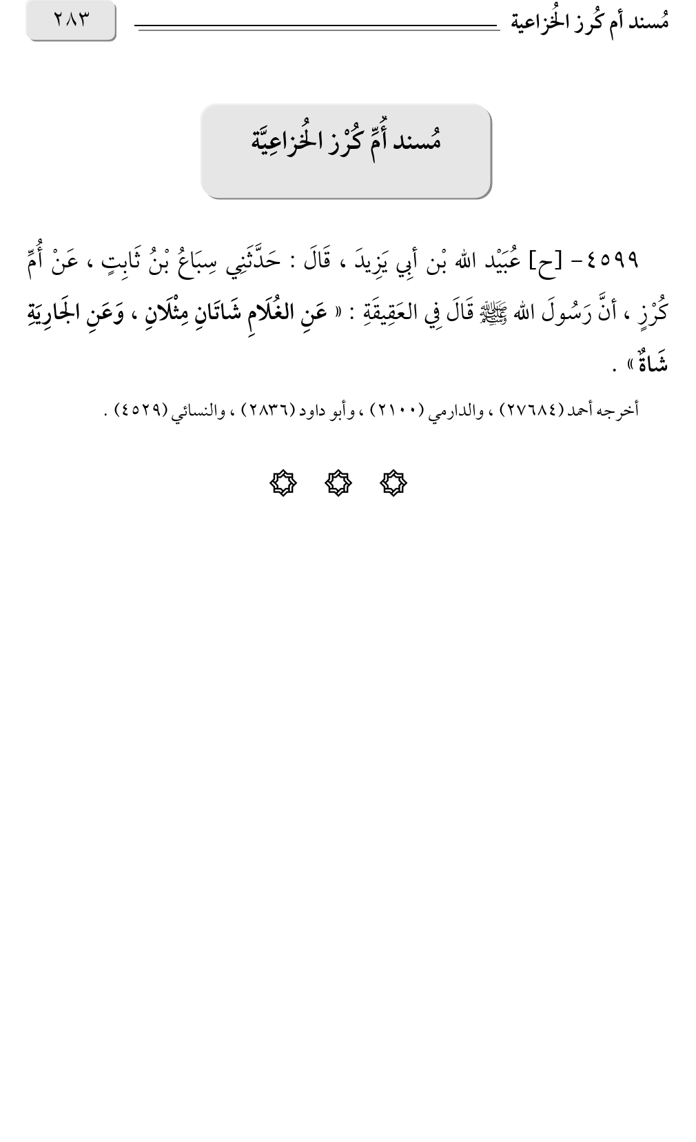 ٤٥٩٩ - [ح] عُبَيْد الله بْن أبِي يَزِيدَ، قَالَ: حَدَّثَنِي سِبَاعُ بْنُ ثَابِتٍ، عَنْ أُمِّ كُرْزٍ، أنَّ رَسُولَ الله صلى الله عليه وسلم قَالَ فِي العَقِيقَةِ: «عَنِ الغُلَامِ شَاتَانِ مِثْلَانِ، وَعَنِ الجَارِيَةِ