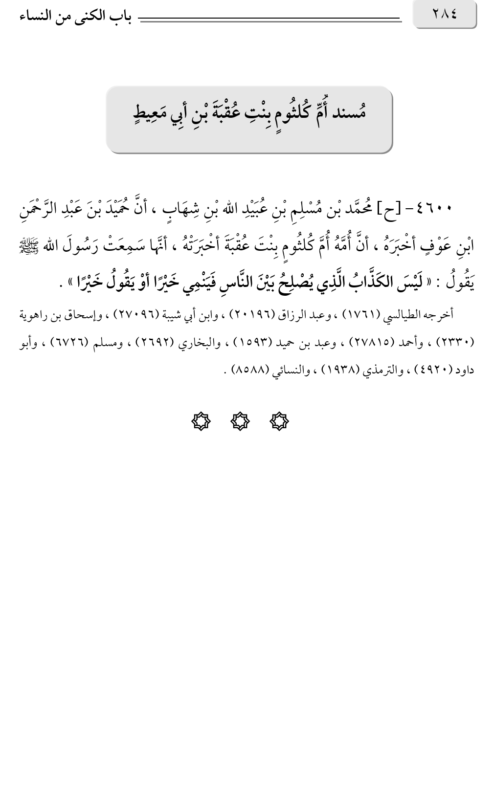 ٤٦٠٠ - [ح] مُحمَّد بْن مُسْلِمِ بْنِ عُبَيْدِ الله بْنِ شِهَابٍ، أنَّ حُمَيْدَ بْنَ عَبْدِ الرَّحْمَنِ ابْنِ عَوْفٍ أخْبَرَهُ، أنَّ أُمَّهُ أُمَّ كُلثُومٍ بِنْتَ عُقْبَةَ أخْبَرَتْهُ، أنَّها سَمِعَتْ رَسُولَ الله صلى الله عليه وسلم يَقُولُ: «لَيْسَ الكَذَّابُ الَّذِي يُصْلِحُ بَيْنَ النَّاسِ فَيَنْمِي خَيْرًا أوْ يَقُولُ خَيْرًا».