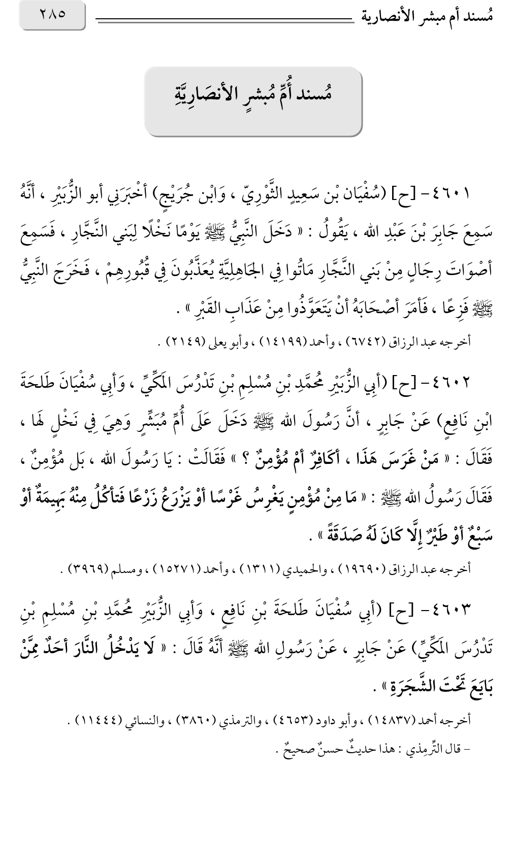 ٤٦٠٢ - [ح] (أبِي الزُّبَيْرِ مُحمَّدِ بْنِ مُسْلِمِ بْنِ تَدْرُسَ المَكِّيِّ، وَأبِي سُفْيَانَ طَلحَةَ ابْنِ نَافِعٍ) عَنْ جَابِرٍ، أنَّ رَسُولَ الله صلى الله عليه وسلم دَخَلَ عَلَى أُمِّ مُبَشِّرٍ وَهِيَ فِي نَخْلٍ لَها، فَقَالَ: «مَنْ غَرَسَ هَذَا، أكَافِرٌ أمْ مُؤْمِنٌ؟ » فَقَالَتْ: يَا رَسُولَ الله، بَل مُؤْمِنٌ، فَقَالَ رَسُولُ الله صلى الله عليه وسلم: «مَا مِنْ مُؤْمِنٍ يَغْرِسُ غَرْسًا أوْ يَزْرَعُ زَرْعًا فَتأكُلُ مِنْهُ بَهِيمَةٌ أوْ سَبْعٌ أوْ طَيْرٌ إِلَّا كَانَ لَهُ صَدَقَةً».