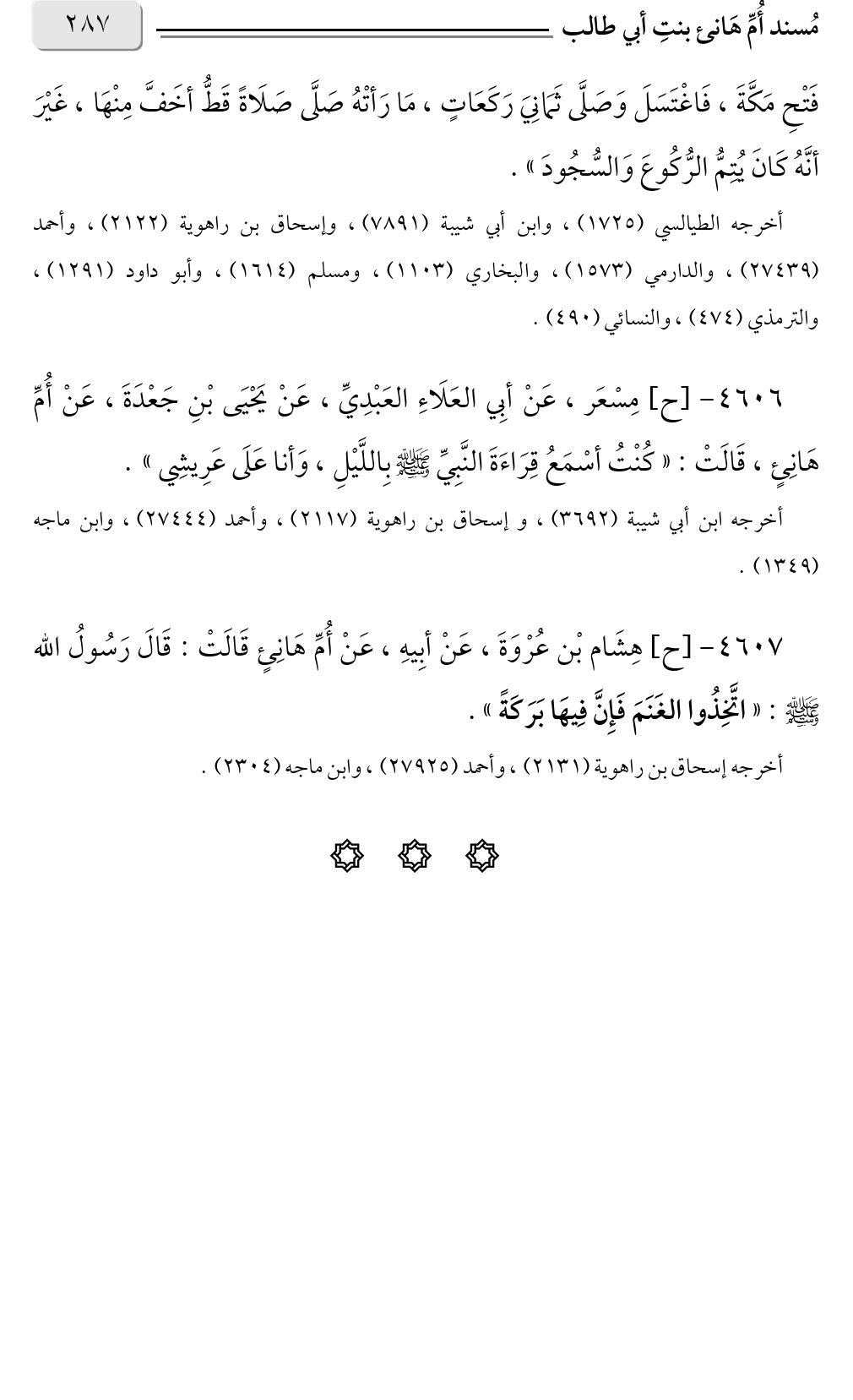 ٤٦٠٧ - [ح] هِشَام بْن عُرْوَةَ، عَنْ أبِيهِ، عَنْ أُمِّ هَانِئٍ قَالَتْ: قَالَ رَسُولُ الله صلى الله عليه وسلم: «اتَّخِذُوا الغَنَمَ فَإِنَّ فِيهَا بَرَكَةً».