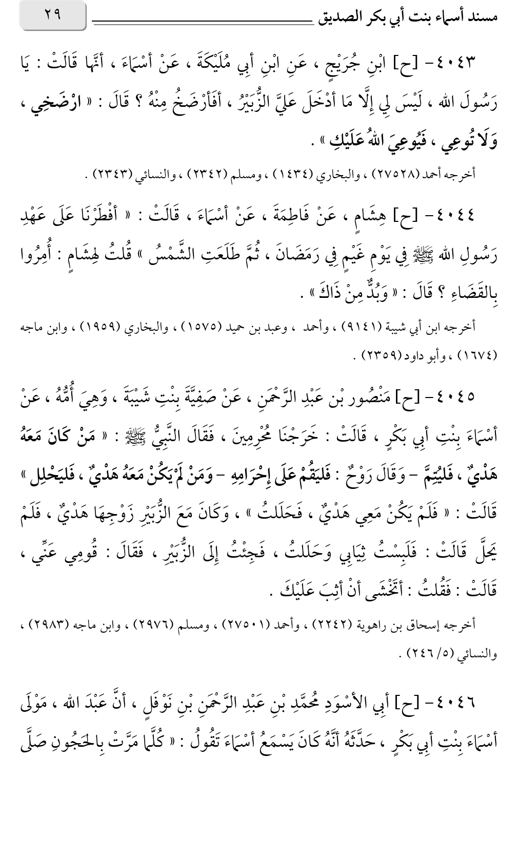 ٤٠٤٥ - [ح] مَنْصُور بْن عَبْدِ الرَّحْمَنِ، عَنْ صَفِيَّةَ بِنْتِ شَيْبَةَ، وَهِيَ أُمُّهُ، عَنْ أسْمَاءَ بِنْتِ أبِي بَكْرٍ، قَالَتْ: خَرَجْنَا مُحْرِمِينَ، فَقَالَ النَّبِيُّ صلى الله عليه وسلم: «مَنْ كَانَ مَعَهُ هَدْيٌ، فَليُتِمَّ - وَقَالَ رَوْحٌ: فَليَقُمْ عَلَى إِحْرَامِهِ - وَمَنْ لَمْ يَكُنْ مَعَهُ هَدْيٌ، فَليَحْلِل» قَالَتْ: «فَلَمْ يَكُنْ مَعِي هَدْيٌ، فَحَلَلتُ» وَكَانَ مَعَ الزُّبَيْرِ زَوْجِهَا هَدْيٌ، فَلَمْ، يَحلَّ قَالَتْ: فَلَبِسْتُ ثِيَابِي وَحَلَلتُ، فَجِئْتُ إِلَى الزُّبَيْرِ، فَقَالَ: قُومِي عَنِّي، قَالَتْ: فَقُلتُ: أتَخْشَى أنْ أثِبَ عَلَيْكَ.