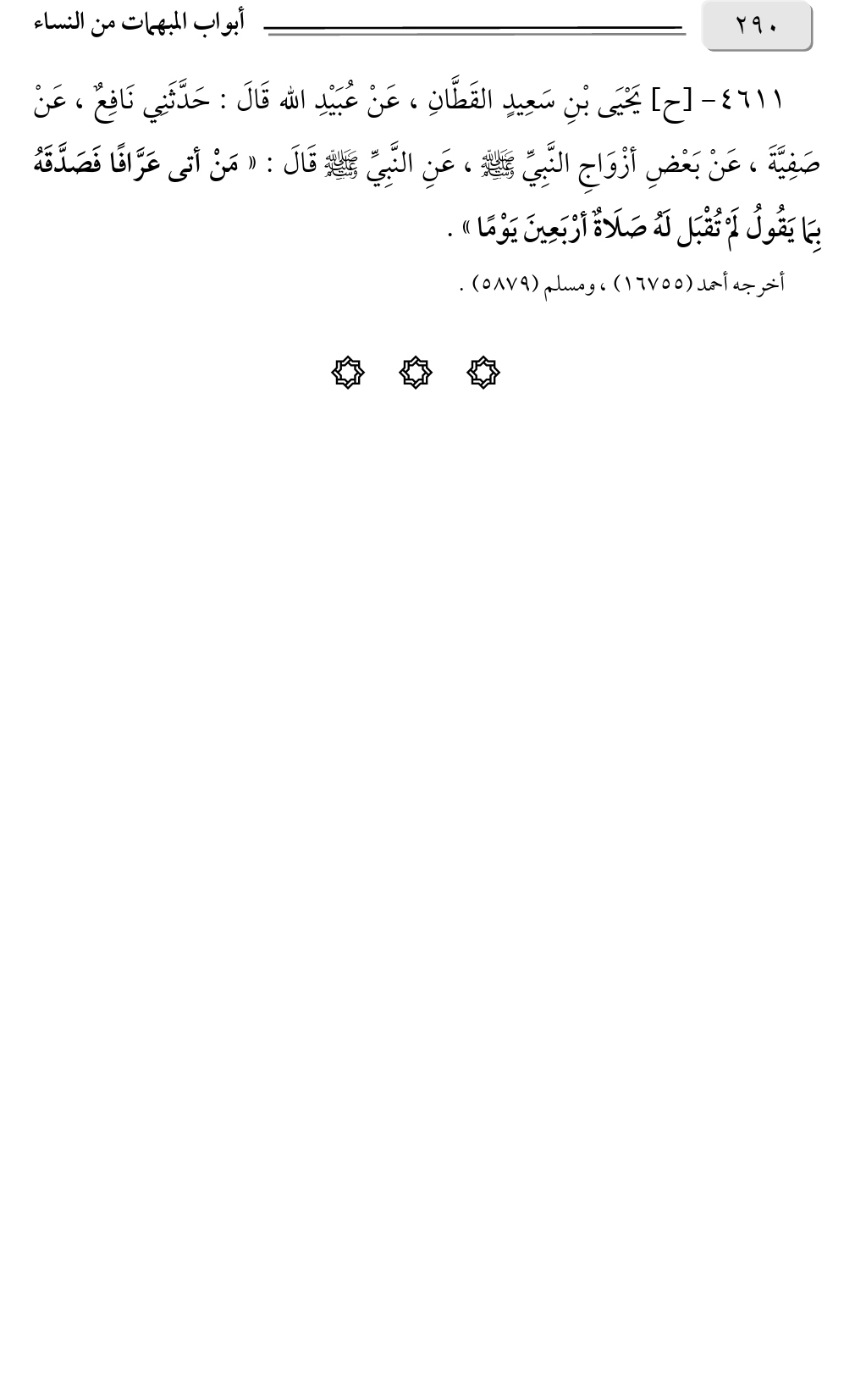 ٤٦١١ - [ح] يَحْيَى بْنِ سَعِيدٍ القَطَّانِ، عَنْ عُبَيْدِ الله قَالَ: حَدَّثَنِي نَافِعٌ، عَنْ صَفِيَّةَ، عَنْ بَعْضِ أزْوَاجِ النَّبِيِّ صلى الله عليه وسلم، عَنِ النَّبِيِّ صلى الله عليه وسلم قَالَ: «مَنْ أتى عَرَّافًا فَصَدَّقَهُ بِمَا يَقُولُ لَمْ تُقْبَل لَهُ صَلَاةٌ أرْبَعِينَ يَوْمًا».
