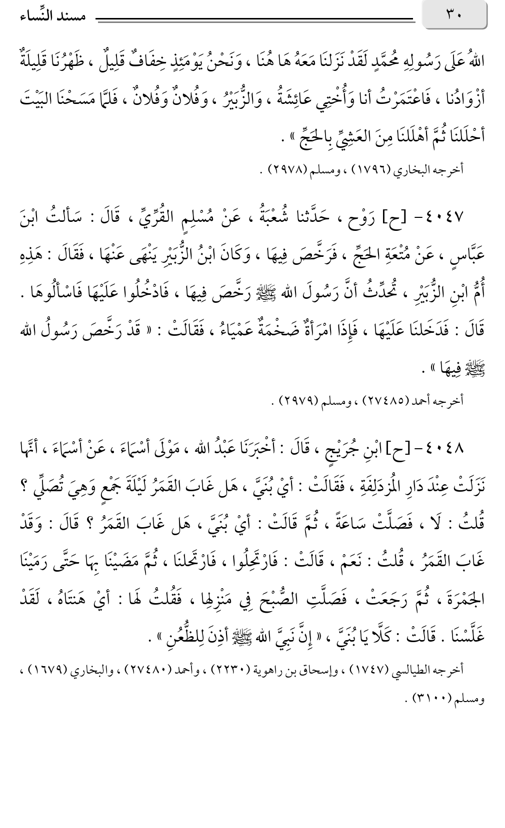 ٤٠٤٨ - [ح] ابْنِ جُرَيْجٍ، قَالَ: أخْبَرَنَا عَبْدُ الله، مَوْلَى أسْمَاءَ، عَنْ أسْمَاءَ، أنَّها نَزَلَتْ عِنْدَ دَارِ المُزدَلِفَةِ، فَقَالَتْ: أيْ بُنَيَّ، هَل غَابَ القَمَرُ لَيْلَةَ جَمْعٍ وَهِيَ تُصَلِّي؟ قُلتُ: لَا، فَصَلَّتْ سَاعَةً، ثُمَّ قَالَتْ: أيْ بُنَيَّ، هَل غَابَ القَمَرُ؟ قَالَ: وَقَدْ غَابَ القَمَرُ، قُلتُ: نَعَمْ، قَالَتْ: فَارْتَحِلُوا، فَارْتَحلنَا، ثُمَّ مَضَيْنَا بِهَا حَتَّى رَمَيْنَا الجَمْرَةَ، ثُمَّ رَجَعَتْ، فَصَلَّتِ الصُّبْحَ فِي مَنْزِلهِا، فَقُلتُ لَها: أيْ هَنتَاهُ، لَقَدْ غَلَّسْنَا. قَالَتْ: كَلَّا يَا بُنَيَّ، «إِنَّ نَبِيَّ الله صلى الله عليه وسلم أذِنَ لِلظُّعُنِ».