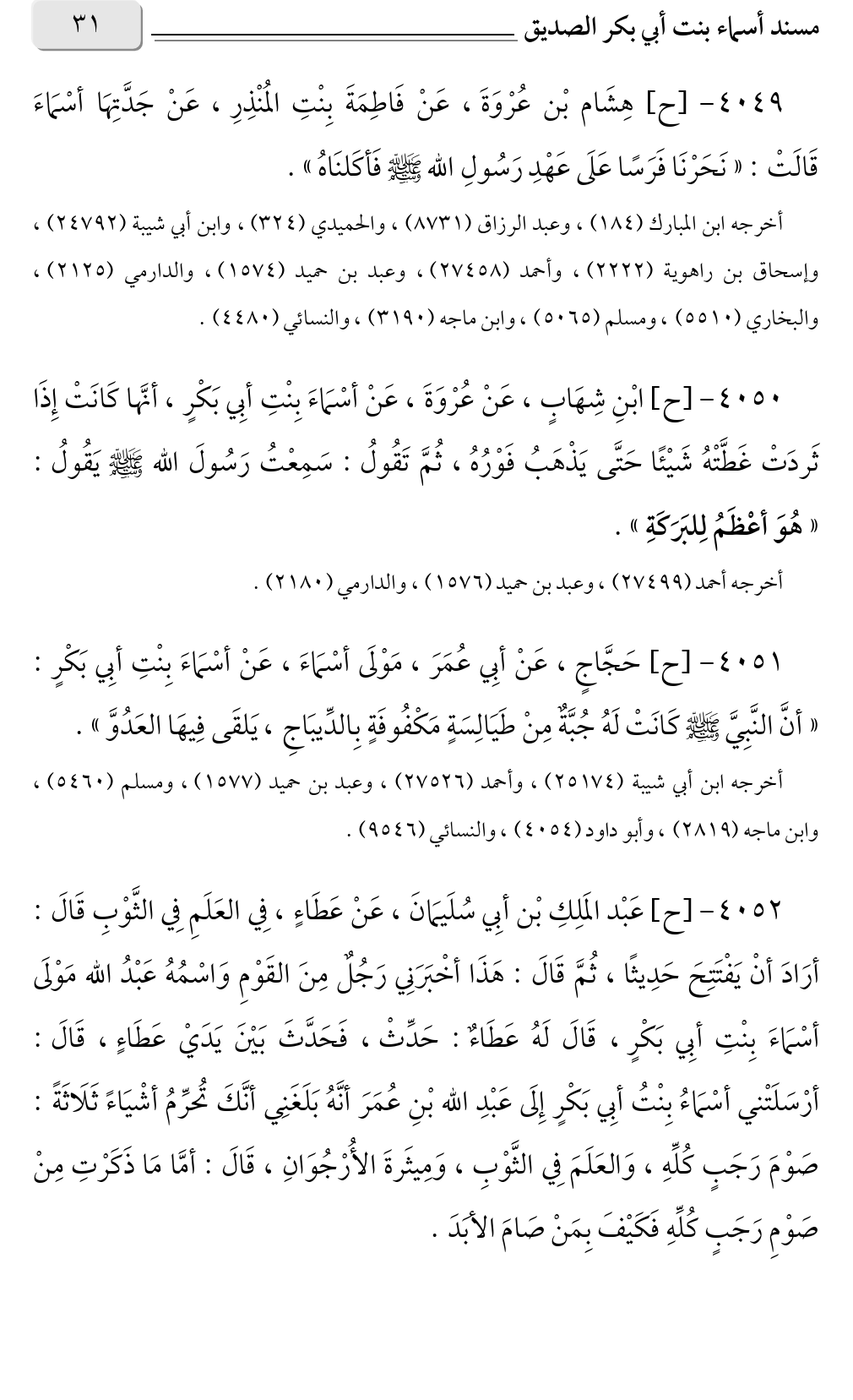 ٤٠٤٩ - [ح] هِشَام بْن عُرْوَةَ، عَنْ فَاطِمَةَ بِنْتِ المُنْذِرِ، عَنْ جَدَّتِهَا أسْمَاءَ قَالَتْ: «نَحَرْنَا فَرَسًا عَلَى عَهْدِ رَسُولِ الله صلى الله عليه وسلم فَأكَلنَاهُ».