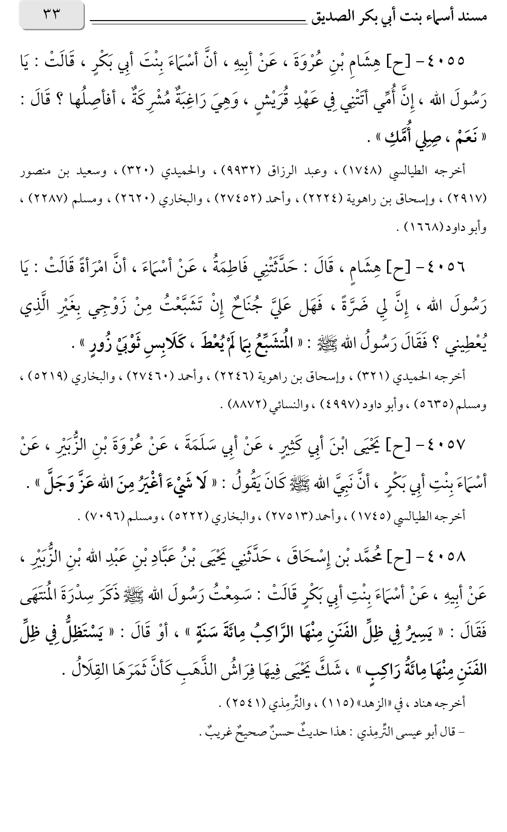 ٤٠٥٥ - [ح] هِشَامِ بْنِ عُرْوَةَ، عَنْ أبِيهِ، أنَّ أسْمَاءَ بِنْتَ أبِي بَكْرٍ، قَالَتْ: يَا رَسُولَ الله، إِنَّ أُمِّي أتَتْنِي فِي عَهْدِ قُرَيْشٍ، وَهِيَ رَاغِبَةٌ مُشْرِكَةٌ، أفأصِلُها؟ قَالَ: «نَعَمْ، صِلي أُمَّكِ».