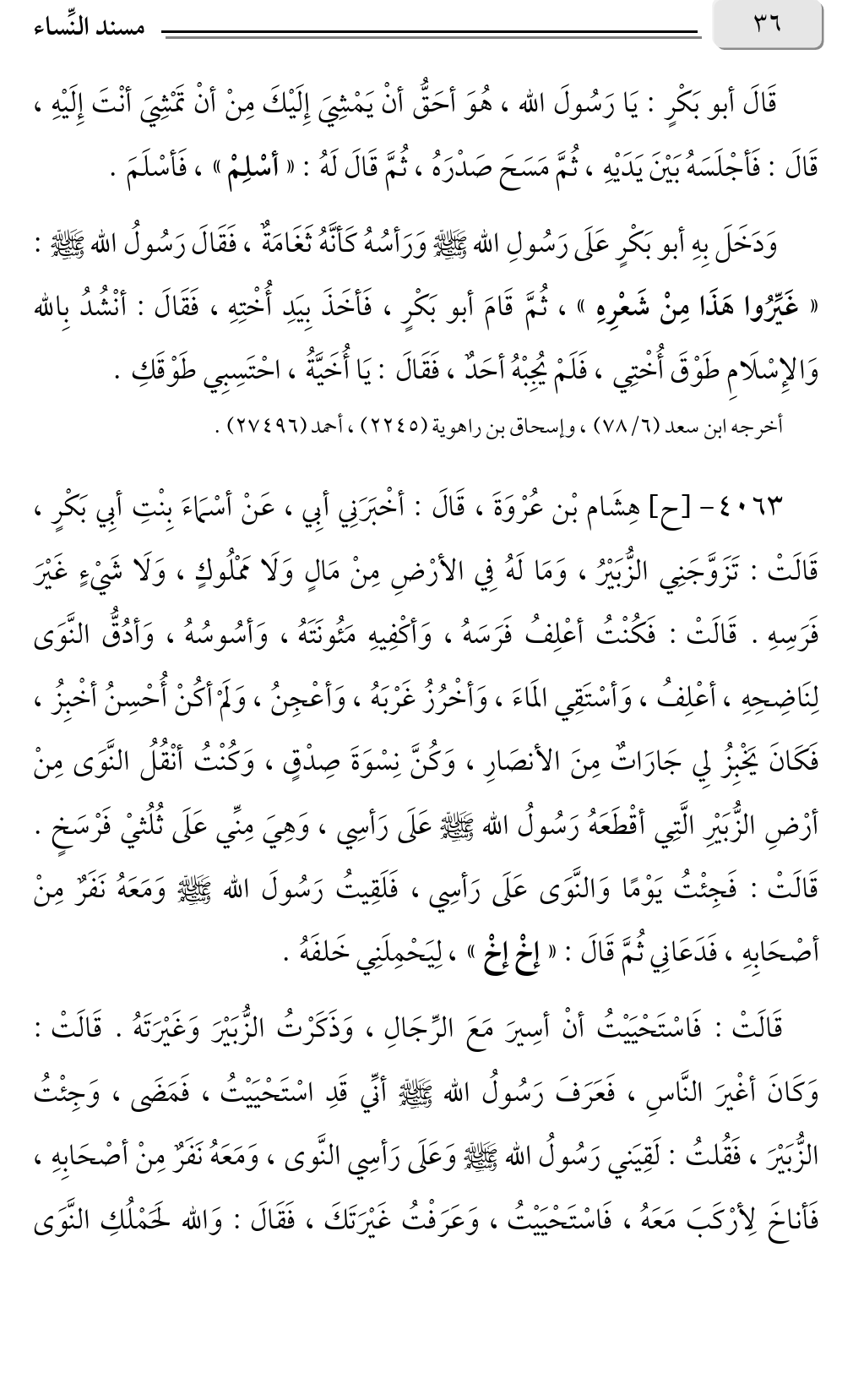 ٤٠٦٣ - [ح] هِشَام بْن عُرْوَةَ، قَالَ: أخْبَرَنِي أبِي، عَنْ أسْمَاءَ بِنْتِ أبِي بَكْرٍ، قَالَتْ: تَزَوَّجَنِي الزُّبَيْرُ، وَمَا لَهُ فِي الأرْضِ مِنْ مَالٍ وَلَا مَمْلُوكٍ، وَلَا شَيْءٍ غَيْرَ فَرَسِهِ. قَالَتْ: فَكُنْتُ أعْلِفُ فَرَسَهُ، وَأكْفِيهِ مَئُونَتَهُ، وَأسُوسُهُ، وَأدُقُّ النَّوَى لِنَاضِحِهِ، أعْلِفُ، وَأسْتَقِي المَاءَ، وَأخْرُزُ غَرْبَهُ، وَأعْجِنُ، وَلَمْ أكُنْ أُحْسِنُ أخْبِزُ، فَكَانَ يَخْبِزُ لِي جَارَاتٌ مِنَ الأنصَارِ، وَكُنَّ نِسْوَةَ صِدْقٍ، وَكُنْتُ أنْقُلُ النَّوَى مِنْ أرْضِ الزُّبَيْرِ الَّتِي أقْطَعَهُ رَسُولُ الله صلى الله عليه وسلم عَلَى رَأسِي، وَهِيَ مِنِّي عَلَى ثُلُثيْ فَرْسَخٍ. قَالَتْ: فَجِئْتُ يَوْمًا وَالنَّوَى عَلَى رَأسِي، فَلَقِيتُ رَسُولَ الله صلى الله عليه وسلم وَمَعَهُ نَفَرٌ مِنْ أصْحَابِهِ، فَدَعَانِي ثُمَّ قَالَ: «إخْ إخْ» لِيَحْمِلَنِي خَلفَهُ.