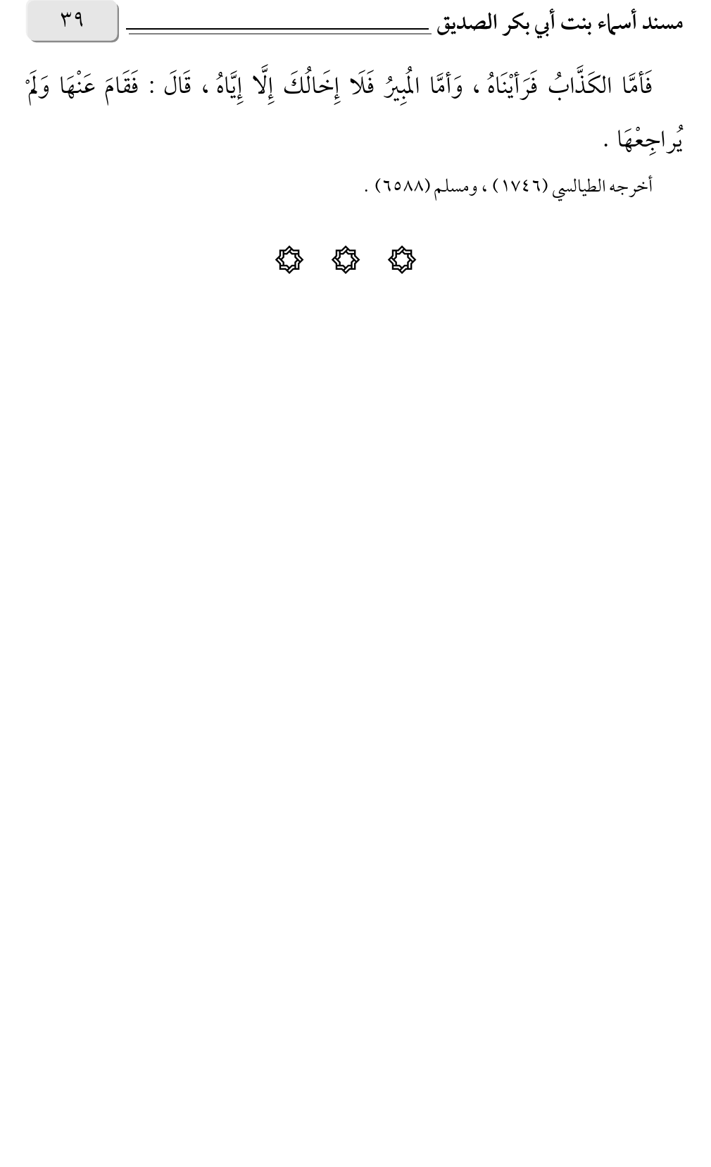 فَأمَّا الكَذَّابُ فَرَأيْنَاهُ، وَأمَّا المُبِيرُ فَلَا إِخَالُكَ إِلَّا إِيَّاهُ، قَالَ: فَقَامَ عَنْهَا وَلَمْ يُراجِعْهَا.