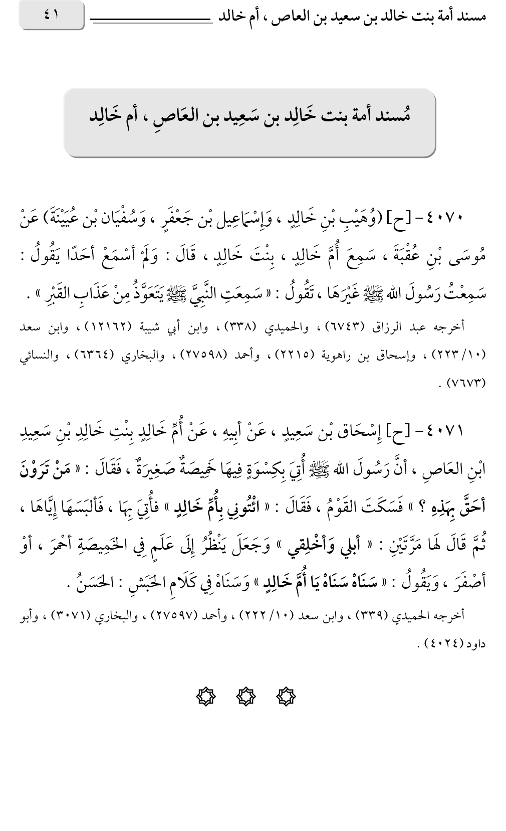 ٤٠٧١ - [ح] إِسْحَاق بْن سَعِيدٍ، عَنْ أبِيهِ، عَنْ أُمِّ خَالِدٍ بِنْتِ خَالِدِ بْنِ سَعِيدِ ابْنِ العَاصِ، أنَّ رَسُولَ الله صلى الله عليه وسلم أُتِيَ بِكِسْوَةٍ فِيهَا خَمِيصَةٌ صَغِيرَةٌ، فَقَالَ: «مَنْ تَرَوْنَ أحَقَّ بِهَذِهِ؟ » فَسَكَتَ القَوْمُ، فَقَالَ: «ائْتُونِي بِأُمِّ خَالِدٍ» فأُتِيَ بِهَا، فَألبَسَهَا إِيَّاهَا، ثُمَّ قَالَ لَها مَرَّتَيْنِ: «أبلي وَأخْلِقي» وَجَعَلَ يَنْظُرُ إِلَى عَلَمٍ فِي الخَمِيصَةِ أحْمرَ، أوْ أصْفَرَ، وَيَقُولُ: «سَنَاهْ سَنَاهْ يَا أُمَّ خَالِدٍ» وَسَنَاهْ فِي كَلَامِ الحَبَشِ: الحَسَنُ.