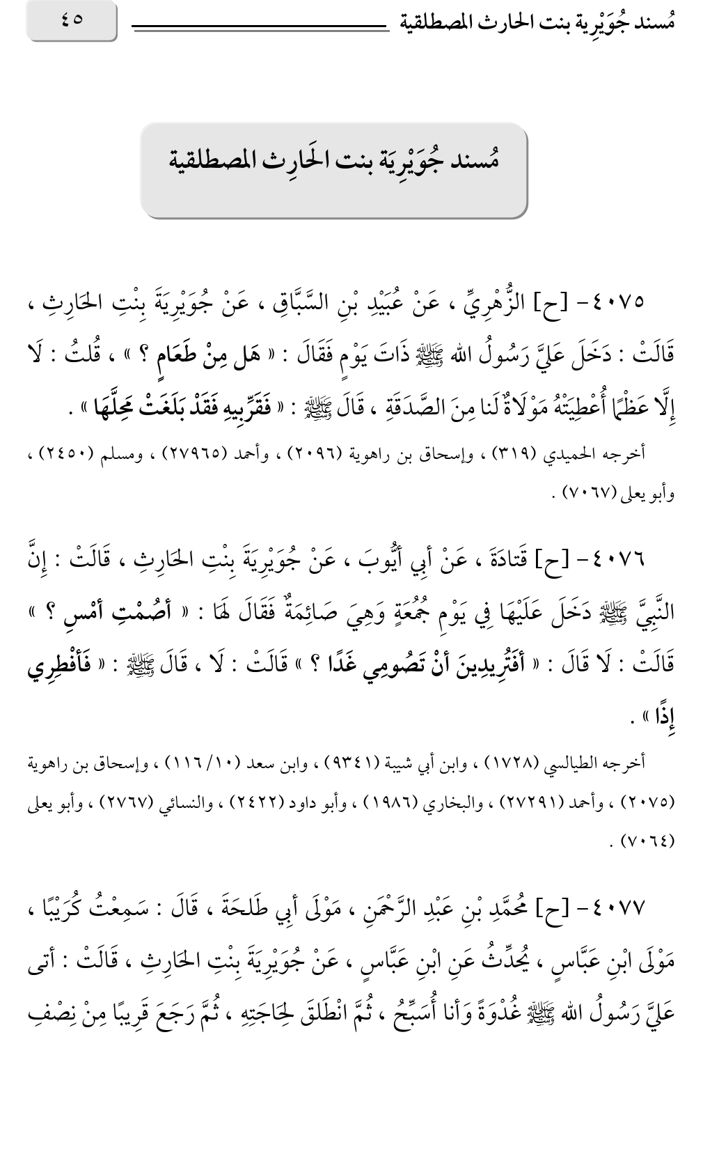 ٤٠٧٧ - [ح] مُحمَّدِ بْنِ عَبْدِ الرَّحْمَنِ، مَوْلَى أبِي طَلحَةَ، قَالَ: سَمِعْتُ كُرَيْبًا، مَوْلَى ابْنِ عَبَّاسٍ، يُحدِّثُ عَنِ ابْنِ عَبَّاسٍ، عَنْ جُوَيْرِيَةَ بِنْتِ الحَارِثِ، قَالَتْ: أتى عَليَّ رَسُولُ الله صلى الله عليه وسلم غُدْوَةً وَأنا أُسَبِّحُ، ثُمَّ انْطَلقَ لحَاجَتِهِ، ثُمَّ رَجَعَ قَرِيبًا مِنْ نِصْفِ