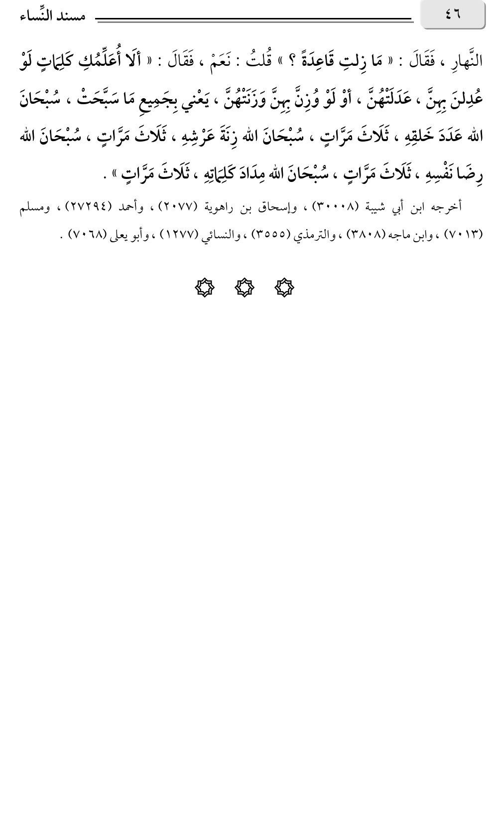 النَّهارِ، فَقَالَ: «مَا زِلتِ قَاعِدَةً؟ » قُلتُ: نَعَمْ، فَقَالَ: «ألَا أُعَلِّمُكِ كَلِمَاتٍ لَوْ عُدِلنَ بِهِنَّ، عَدَلَتْهُنَّ، أوْ لَوْ وُزِنَّ بِهِنَّ وَزَنَتْهُنَّ، يَعْني بِجَمِيعِ مَا سَبَّحَتْ، سُبْحَانَ الله عَدَدَ خَلقِهِ، ثَلَاثَ مَرَّاتٍ، سُبْحَانَ الله زِنَةَ عَرْشِهِ، ثَلَاثَ مَرَّاتٍ، سُبْحَانَ الله رِضَا نَفْسِهِ، ثَلَاثَ مَرَّاتٍ، سُبْحَانَ الله مِدَادَ كَلِمَاتِهِ، ثَلَاثَ مَرَّاتٍ».