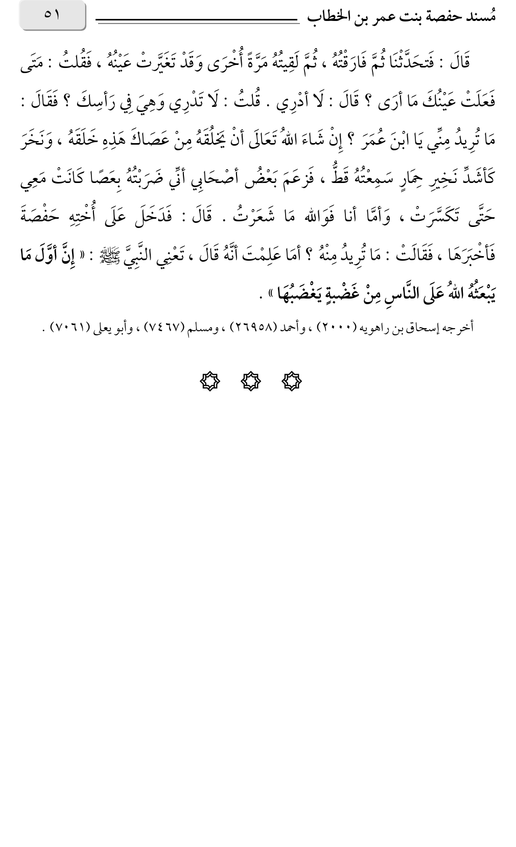 قَالَ: فَتحَدَّثْنَا ثُمَّ فَارَقْتُهُ، ثُمَّ لَقِيتُهُ مَرَّةً أُخْرَى وَقَدْ تَغَيَّرتْ عَيْنُهُ، فَقُلتُ: مَتَى فَعَلَتْ عَيْنُكَ مَا أرَى؟ قَالَ: لَا أدْرِي. قُلتُ: لَا تَدْرِي وَهِيَ فِي رَأسِكَ؟ فَقَالَ: مَا تُرِيدُ مِنِّي يَا ابْنَ عُمَرَ؟ إِنْ شَاءَ اللهُ تَعَالَى أنْ يَخلُقَهُ مِنْ عَصَاكَ هَذِهِ خَلَقَهُ، وَنَخَرَ كَأشَدِّ نَخِيرِ حِمَارٍ سَمِعْتُهُ قَطُّ، فَزعَمَ بَعْضُ أصْحَابِي أنِّي ضَرَبْتُهُ بِعَصًا كَانَتْ مَعِي حَتَّى تَكَسَّرَتْ، وَأمَّا أنا فَوَالله مَا شَعَرْتُ. قَالَ: فَدَخَلَ عَلَى أُخْتِهِ حَفْصَةَ فَأخْبَرَهَا، فَقَالَتْ: مَا تُرِيدُ مِنْهُ؟ أمَا عَلِمْتَ أنَّهُ قَالَ، تَعْنِي النَّبِيَّ صلى الله عليه وسلم: «إِنَّ أوَّلَ مَا يَبْعَثُهُ اللهُ عَلَى النَّاسِ مِنْ غَضْبةٍ يَغْضَبُهَا».