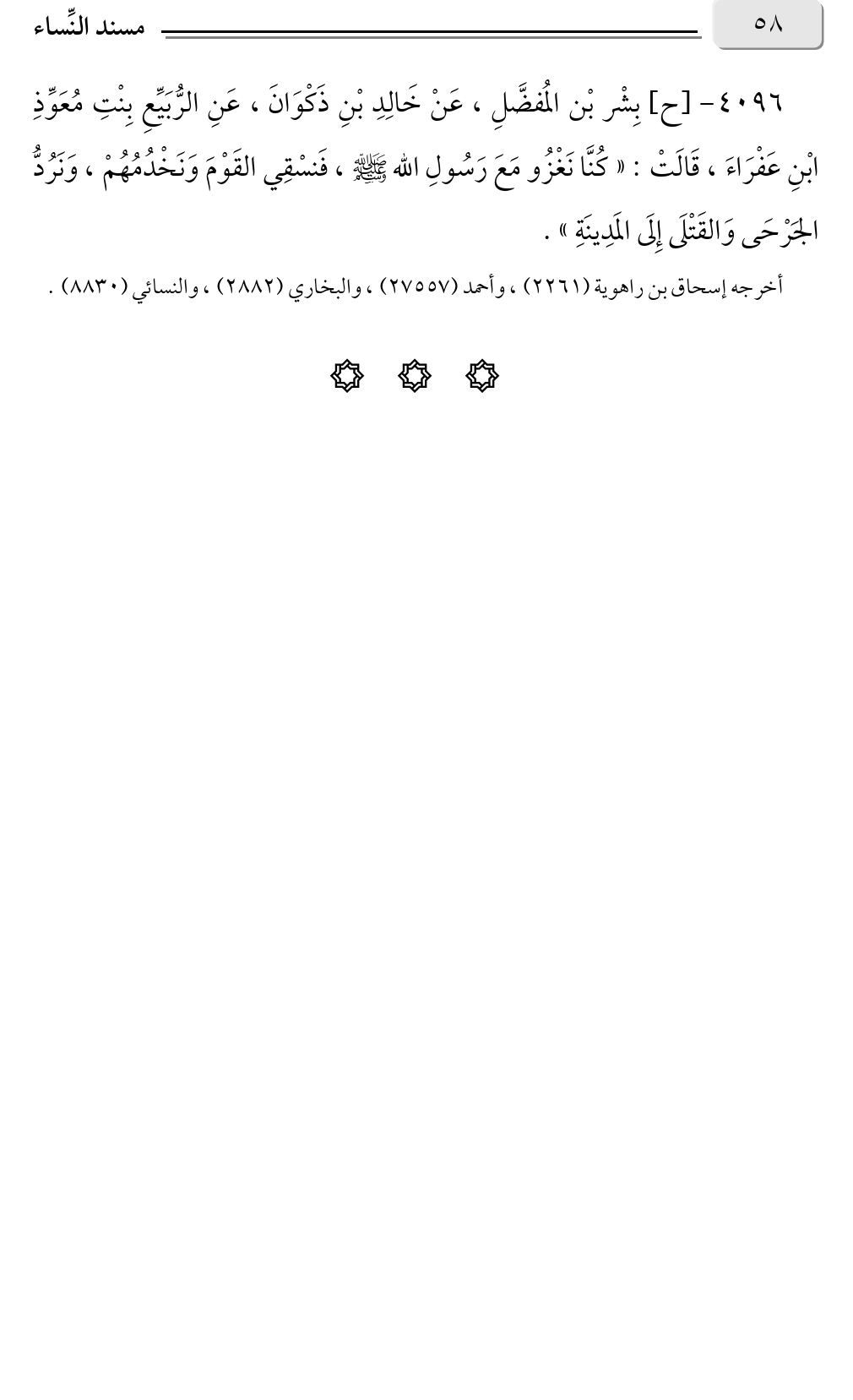 ٤٠٩٦ - [ح] بِشْر بْن المُفضَّلِ، عَنْ خَالِدِ بْنِ ذَكْوَانَ، عَنِ الرُّبَيِّعِ بِنْتِ مُعَوِّذِ ابْنِ عَفْرَاءَ، قَالَتْ: «كُنَّا نَغْزُو مَعَ رَسُولِ الله صلى الله عليه وسلم، فَنسْقِي القَوْمَ وَنَخْدُمُهُمْ، وَنَرُدُّ الجَرْحَى وَالقَتْلَى إِلَى المَدِينَةِ».