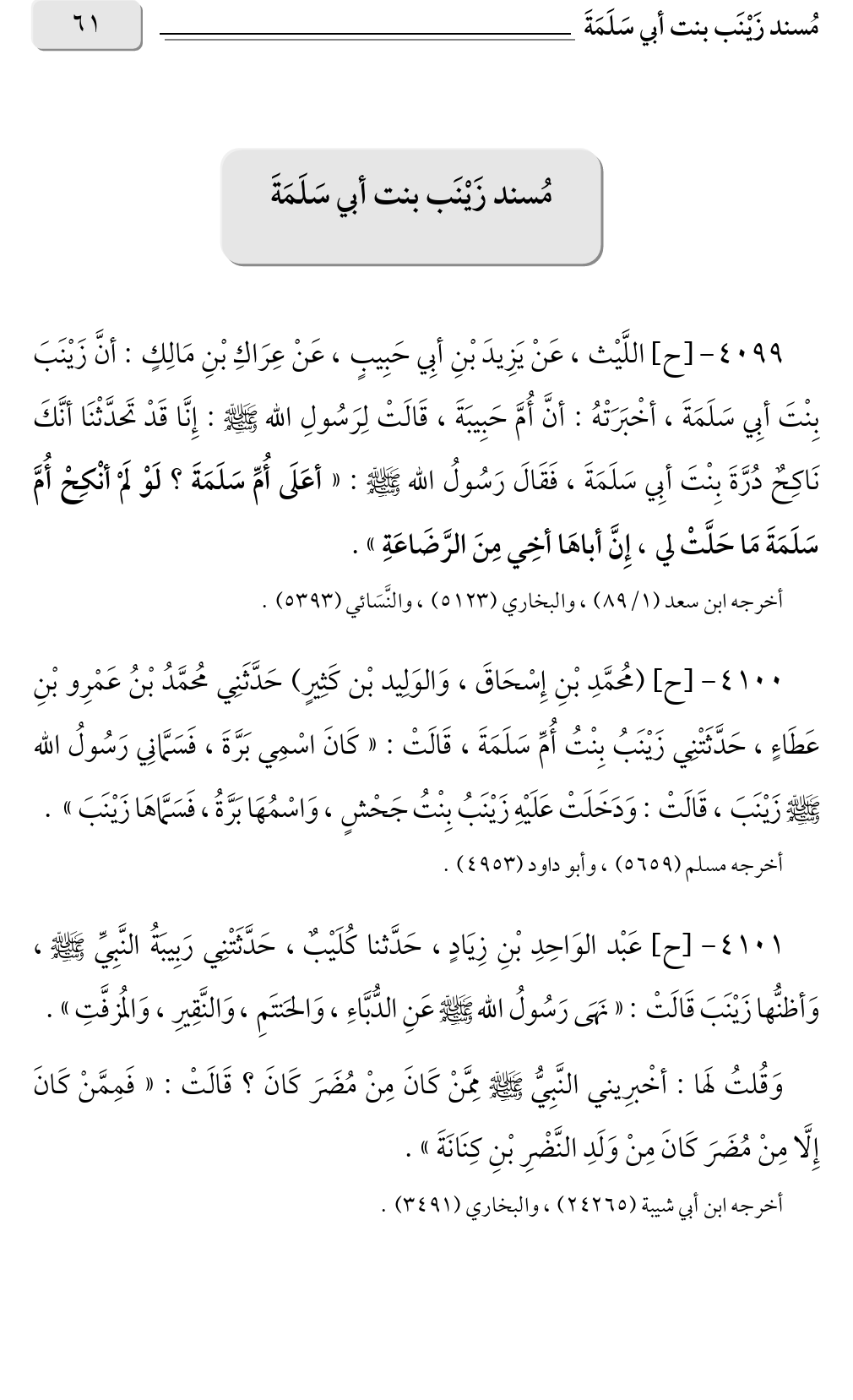 ٤١٠٠ - [ح] (مُحمَّدِ بْنِ إِسْحَاقَ، وَالوَلِيد بْن كَثِيرٍ) حَدَّثَنِي مُحمَّدُ بْنُ عَمْرِو بْنِ عَطَاءٍ، حَدَّثَتْنِي زَيْنَبُ بِنْتُ أُمِّ سَلَمَةَ، قَالَتْ: «كَانَ اسْمِي بَرَّةَ، فَسَمَّانِي رَسُولُ الله صلى الله عليه وسلم زَيْنَبَ، قَالَتْ: وَدَخَلَتْ عَلَيْهِ زَيْنَبُ بِنْتُ جَحْشٍ، وَاسْمُهَا بَرَّةُ، فَسَمَّاهَا زَيْنَبَ».