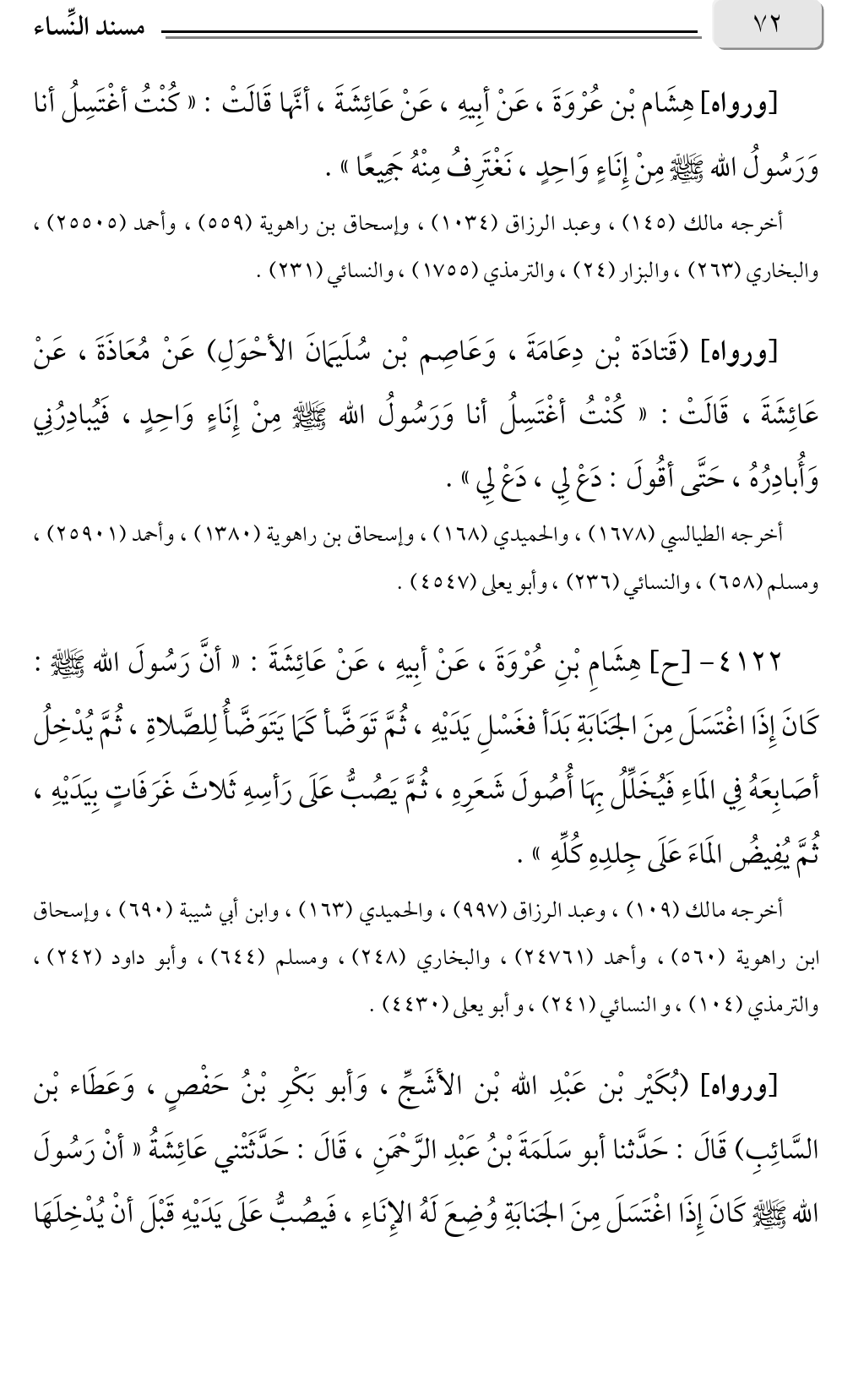 [ورواه] هِشَام بْن عُرْوَةَ، عَنْ أبِيهِ، عَنْ عَائِشَةَ، أنَّها قَالَتْ: «كُنْتُ أغْتَسِلُ أنا وَرَسُولُ الله صلى الله عليه وسلم مِنْ إِنَاءٍ وَاحِدٍ، نَغْتَرِفُ مِنْهُ جَمِيعًا».