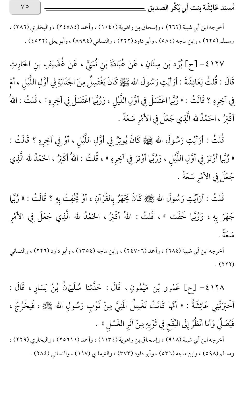 ٤١٢٧ - [ح] بُرْد بْن سِنَانٍ، عَنْ عُبَادَةَ بْنِ نُسَيٍّ، عَنْ غُضَيْفِ بْنِ الحَارِثِ قَالَ: قُلتُ لِعَائِشَةَ: أرَأيْتِ رَسُولَ الله صلى الله عليه وسلم كَانَ يَغْتَسِلُ مِنَ الجَنَابَةِ فِي أوَّلِ اللَّيْلِ، أمْ فِي آخِرِهِ؟ قَالَتْ: «رُبَّما اغْتَسَلَ فِي أوَّلِ اللَّيْلِ، وَرُبَّما اغْتَسَلَ فِي آخِرِهِ» قُلتُ: اللهُ، أكْبَرُ، الحَمْدُ لله الَّذِي جَعَلَ فِي الأمْرِ سَعَةً.