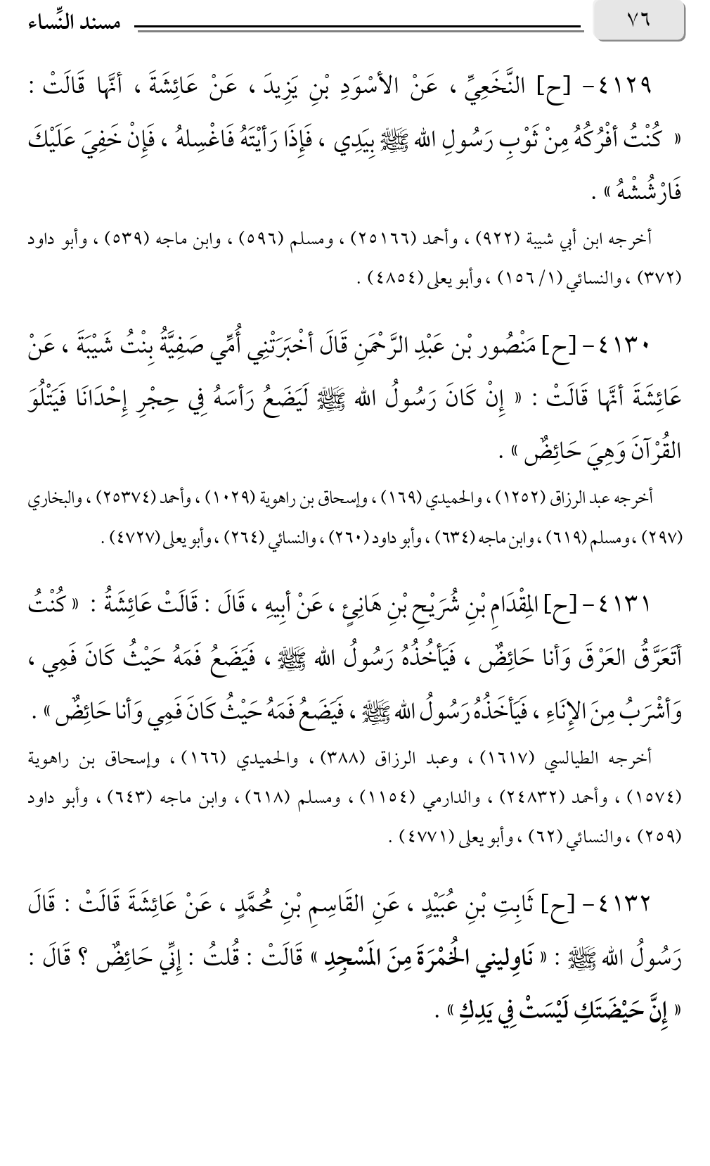 ٤١٣١ - [ح] المِقْدَامِ بْنِ شُرَيْحِ بْنِ هَانِئٍ، عَنْ أبِيهِ، قَالَ: قَالَتْ عَائِشَةُ: «كُنْتُ أتَعَرَّقُ العَرْقَ وَأنا حَائِضٌ، فَيَأخُذُهُ رَسُولُ الله صلى الله عليه وسلم، فَيَضَعُ فَمَهُ حَيْثُ كَانَ فَمِي، وَأشْرَبُ مِنَ الإِنَاءِ، فَيَأخَذُهُ رَسُولُ الله صلى الله عليه وسلم، فَيَضَعُ فَمَهُ حَيْثُ كَانَ فَمِي وَأنا حَائِضٌ».