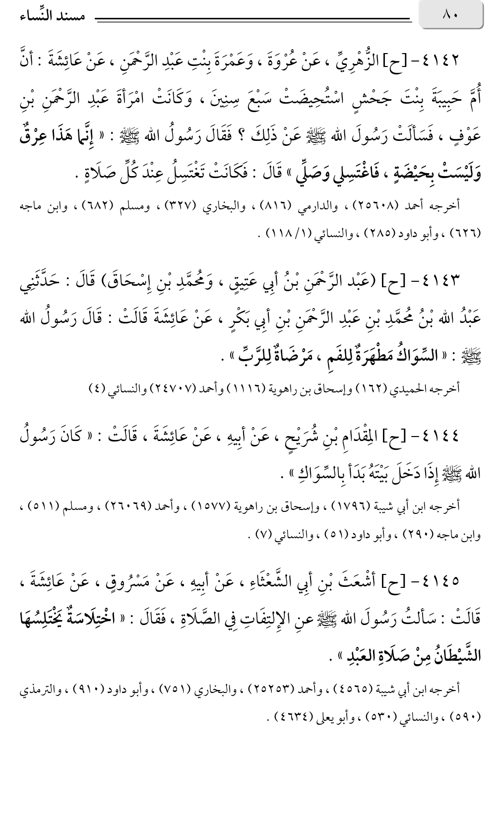 ٤١٤٣ - [ح] (عَبْد الرَّحْمَنِ بْنُ أبِي عَتِيقٍ، وَمُحمَّدِ بْنِ إِسْحَاقَ) قَالَ: حَدَّثَنِي عَبْدُ الله بْنُ مُحمَّدِ بْنِ عَبْدِ الرَّحْمَنِ بْنِ أبِي بَكْرٍ، عَنْ عَائِشَةَ قَالَتْ: قَالَ رَسُولُ الله صلى الله عليه وسلم: «السِّوَاكُ مَطْهَرَةٌ لِلفَمِ، مَرْضَاةٌ لِلرَّبِّ».