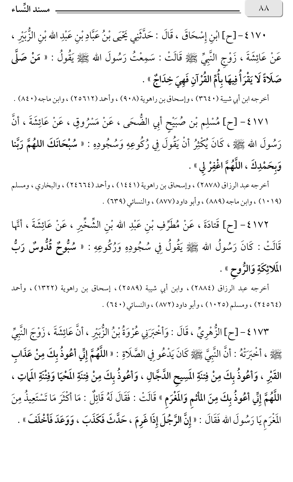 ٤١٧٠ - [ح] ابْنِ إِسْحَاقَ، قَالَ: حَدَّثَنِي يَحْيَى بْنُ عَبَّادِ بْنِ عَبْدِ الله بْنِ الزُّبَيْرِ، عَنْ عَائِشَةَ، زَوْجِ النَّبِيِّ صلى الله عليه وسلم قَالَتْ: سَمِعْتُ رَسُولَ الله صلى الله عليه وسلم يَقُولُ: «مَنْ صَلَّى صَلَاةً لَا يَقْرَأُ فِيهَا بِأُمِّ القُرْآنِ فَهِيَ خِدَاجٌ».