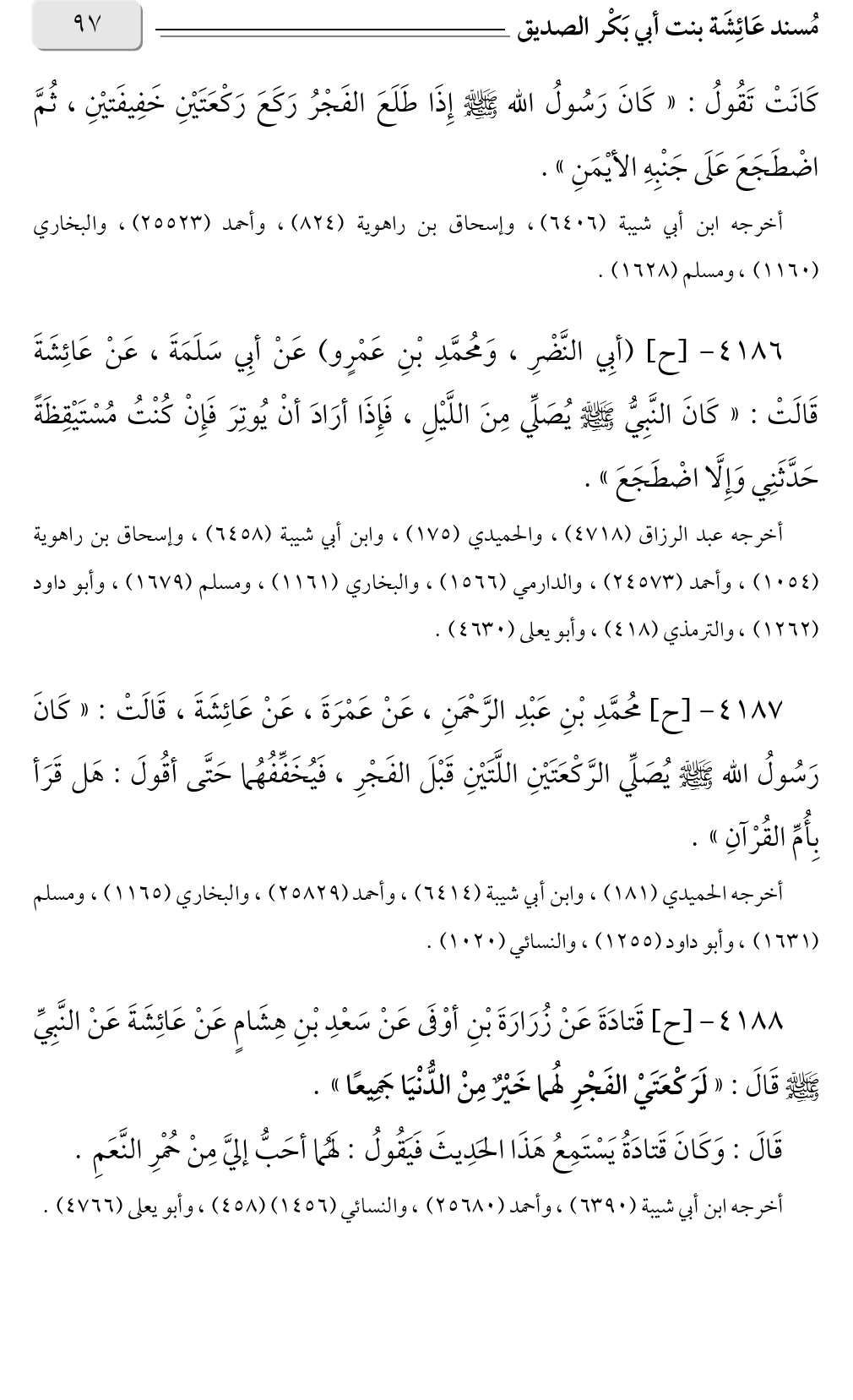 كَانَتْ تَقُولُ: «كَانَ رَسُولُ الله صلى الله عليه وسلم إِذَا طَلَعَ الفَجْرُ رَكَعَ رَكْعَتَيْنِ خَفِيفَتيْنِ، ثُمَّ اضْطَجَعَ عَلَى جَنْبِهِ الأيْمَنِ».
