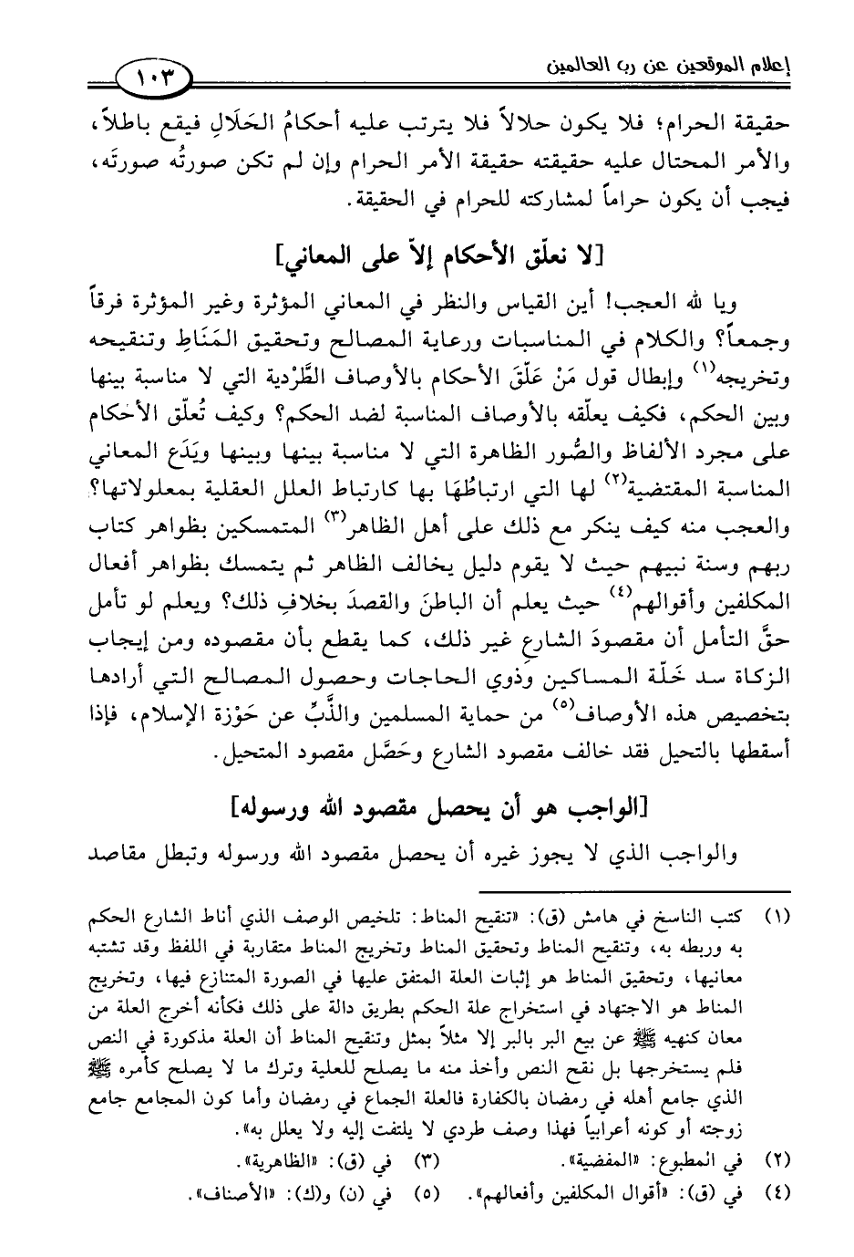 وياللَّه العجب! أين القياس والنظر في المعاني المؤثرة وغير المؤثرة فرقًا وجمعًا؟ والكلام في المناسبات ورعاية المصالح وتحقيق المَنَاطِ وتنقيحه وتخريجه (١) وإبطال قول مَنْ عَلّقَ الأحكام بالأوصاف الطَّرْدية التي لا مناسبة بينها وبين الحكم، فكيف يعلّقه بالأوصاف المناسبة لضد الحكم؟ وكيف تُعلّق الأحكام على مجرد الألفاظ والصُّور الظاهرة التي لا مناسبة بينها وبينها وَيدَع المعاني المناسبة المقتضية (٢) لها التي ارتباطُها بها كارتباط العلل العقلية بمعلولاتها؟ والعجب منه كيف ينكر مع ذلك على أهل الظاهر (٣) المتمسكين بظواهر كتاب ربهم وسنة نبيهم حيث لا يقوم دليل يخالف الظاهر ثم يتمسك بظواهر أفعال المكلفين وأقوالهم (٤) حيث يعلم أن الباطنَ والقصدَ بخلافِ ذلك؟ ويعلم لو تأمل حق التأمل أن مقصودَ الشارعِ غير ذلك، كما يقطع بأن مقصوده ومن إيجاب الزكاة سد خَلّة المساكين وذوي الحاجات وحصول المصالح التي أرادها بتخصيص هذه الأوصاف (٥) من حماية المسلمين والذَّبِّ عن حَوْزة الإسلام، فإذا أسقطها بالتحيل فقد خالف مقصود الشارع وحَصَّل مقصود المتحيل.