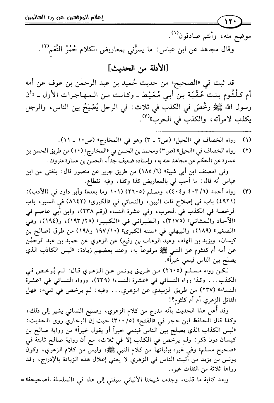 وقد أعل هذا الحديث بأنه مدرج من كلام الزهري، وصنيع النسائي يشير إلى ذلك، وكذا قال الحافظ ابن حجر في "الفتح" (٥/ ٣٠٠) حيث إن البخاري روى الحديث: "ليس الكذاب، لذي يصلح بين الناس فينمي خيرًا أو يقول خيرًا" من رواية صالح بن كيسان دون ذكر: ولم يرخص في الكذب إلا في ثلاث، مع أن رواية صالح ثابتة في "صحيح مسلم" وفي غيره بإثباتها من كلام النبي -صلى اللَّه عليه وسلم-، وليس من كلام الزهري، وكون يونس بن يزيد من أثبت الناس في الزهري لا يعني إعلال هذه الزيادة بالإدراج، وقد رواها ثلاثة من الثقات غيره.