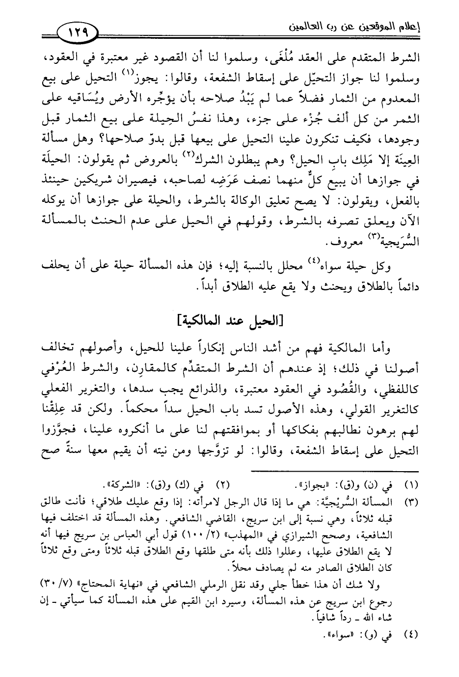 وأما المالكية فهم من أشد الناس إنكارًا علينا للحيل، وأصولهم تخالف أصولنا في ذلك؛ إذ عندهم أن الشرط المتقدِّم كالمقارِن، والشرط العُرْفي كاللفظي، والقُصُود في العقود معتبرة، والذرائع يجب سدها، والتغرير الفعلي كالتغرير القولي، وهذه الأصول تسد باب الحيل سدًا محكمًا. ولكن قد عِلِقْنا لهم برهون نطالبهم بفكاكها أو بموافقتهم لنا على ما أنكروه علينا، فجوَّزوا التحيل على إسقاط الشُّفعة، وقالواة لو تزوَّجها ومن نيته أن يقيم معها سنةً صح