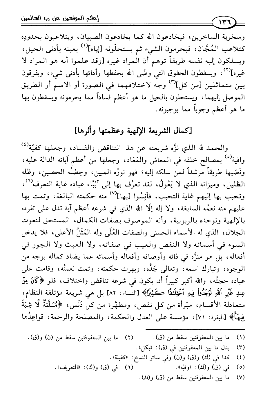 والحمد للَّه الذي نزَّه شريعته عن هذا التناقض والفساد، وجعلها كفيّة (٤) وافية (٥) بمصالح خلقه في المعاش والمَعَاد، وجعلها من أعظم آياته الدالة عليه، ونَصَبها طريقًا مرشدًا لمن سلكه إليه؛ فهو نورُه المبين، وحِصْنُه الحصين، وظله الظليل، وميزانه الذي لا يَعُولُ، لقد تعرَّف بها إلى ألِبَّاء عباده غاية التعرف (٦)، وتحبب بها إليهم غاية التحبب، فأنِسُوا [بها] (٧) منه حكمته البالغة، وتمت بها عليهم منه نعمُه السابغة، ولا إله إلّا اللَّه الذي في شرعه أعظم آية تدل على تفرده بالإلهية وتوحده بالربوبية، وأنه الموصوف بصفات الكمال، المستحق لنعوت الجلال، الذي له الأسماء الحسنى والصفات العُلَى وله المَثَلُ الأعلى، فلا يدخل السوء في أسمائه ولا النقص والعيب في صفاته، ولا العبث ولا الجور في أفعاله، بل هو منزَّه في ذاته وأوصافه وأفعاله وأسمائه عما يضاد كماله بوجه من الوجوه، وتبارك اسمه، وتعالى جَدُّه، وبهرت حكمته، وتمت نعمتُه، وقامت على عباده حجتُه، واللَّه أكبر كبيرًا أن يكون في شرعه تناقض واختلاف، فلو {وَلَوْ كَانَ مِنْ عِنْدِ غَيْرِ اللَّهِ لَوَجَدُوا فِيهِ اخْتِلَافًا كَثِيرًا} [النساء: ٨٢] بل هي شريعة مؤتلفة النظام، متعادلة الأقسام، مبّرأة من كل نقص، ومطهَّرة من كل دَنَس، {مُسَلَّمَةٌ لَا شِيَةَ فِيهَا} [البقرة: ٧١]، مؤسسة على العدل والحكمة، والمصلحة والرحمة، قواعِدُها