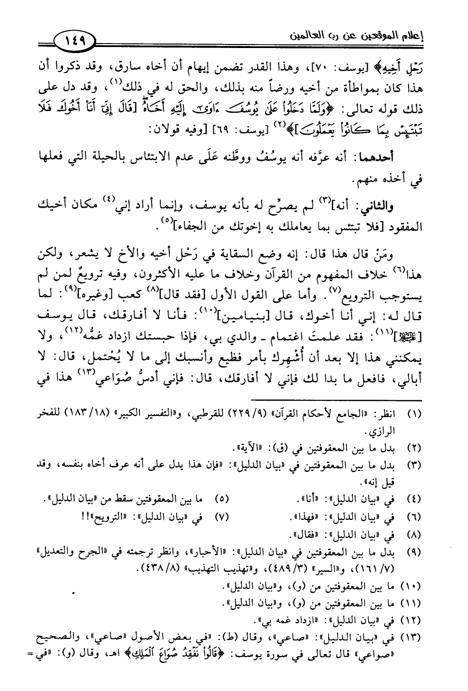 رَحْلِ أَخِيهِ} [يوسف: ٧٠]، وهذا القدر تضمن إيهام أن أخاه سارق، وقد ذكروا أن هذا كان بمواطأة من أخيه ورضًا منه بذلك، والحق له فيم ذلك (١)، وقد دل على ذلك قوله تعالى: {وَلَمَّا دَخَلُوا عَلَى يُوسُفَ آوَى إِلَيْهِ أَخَاهُ [قَالَ إِنِّي أَنَا أَخُوكَ فَلَا تَبْتَئِسْ بِمَا كَانُوا يَعْمَلُونَ]} (٢) [يوسف: ٦٩] [وفيه قولان: