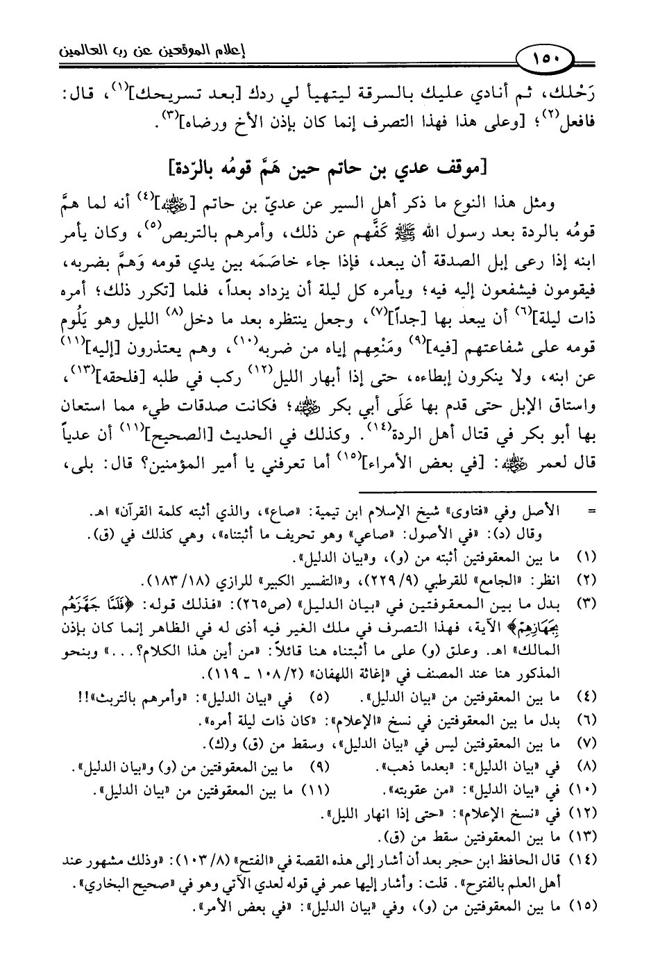 ومثل هذا النوع ما ذكر أهل السير عن عديّ بن حاتم [-رضي اللَّه عنه-] (٤) أنه لما همَّ قومُه بالردة بعد رسول اللَّه -صلى اللَّه عليه وسلم- كَفَّهم عن ذلك، وأمرهم بالتربص (٥)، وكان يأمر ابنه إذا رعى إبل الصدقة أن يبعد، فإذا جاء خاصَمَه بين يدي قومه وَهمَّ بضربه، فيقومون فيشفعون إليه فيه؛ ويأمره كل ليلة أن يزداد بعدًا، فلما [تكرر ذلك؛ أمره ذات ليلة] (٦) أن يبعد بها [جدًا] (٧)، وجعل ينتظره بعد ما دخل (٨) الليل وهو يَلُوم قومه على شفاعتهم [فيه] (٩) ومَنْعِهم إياه من ضربه (١٠)، وهم يعتذرون [إليه] (١١) عن ابنه، ولا ينكرون إبطاءه، حتى إذا أبهار الليل (١٢) ركب في طلبه [فلحقه] (١٣)، واستاق الإبل حتى قدم بها عَلَى أبي بكر -رضي اللَّه عنه-؛ فكانت صدقات طيء مما استعان بها أبو بكر في قتال أهل الردة (١٤). وكذلك في الحديث [الصحيح] (١١) أن عديًا قال لعمر -رضي اللَّه عنه-: [في بعض الأمراء] (١٥) أما تعرفني يا أمير المؤمنين؟ قال: بلى،