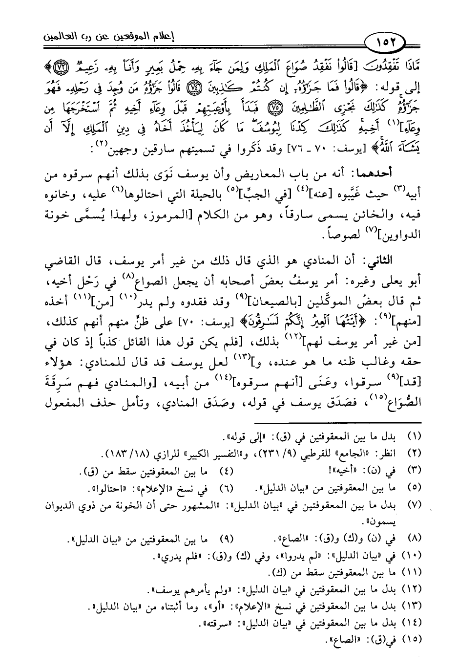 افثاني: أن المنادي هو الذي قال ذلك من غير أمر يوسف، قال القاضي أبو يعلى وغيره: أمر يوسفُ بعضَ أصحابه أن يجعل الصواع (٨) في رَحْل أخيه، ثم قال بعضُ الموكَّلين [بالصيعان] (٩) وقد فقدوه ولم يدر (١٠) [من] (١١) أخذه [منهم] (٩): {أَيَّتُهَا الْعِيرُ إِنَّكُمْ لَسَارِقُونَ} [يوسف: ٧٠] على ظنٍّ منهم أنهم كذلك، [من غير أمر يوسف لهم] (١٢) بذلك، [فلم يكن قول هذا القائل كذبًا إذ كان في حقه وغالب ظنه ما هو عنده، و] (١٣) لعل يوسف قد قال للمنادي: هؤلاء [قد] (٩) سرقوا، وعَنَى [أنهم سرقوه] (١٤) من أبيه، [والمنادي فهم سَرِقَةَ الصُّوَاع (١٥)، فصَدَق يوسف في قوله، وصَدَق المنادي، وتأمل حذف المفعول