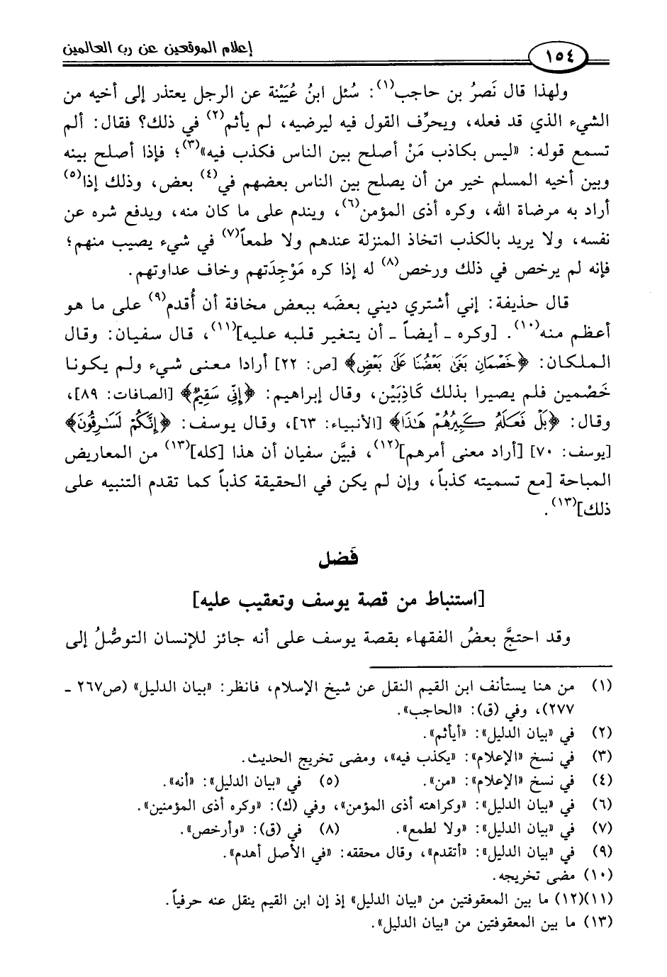 قال حذيفة: إني أشتري ديني بعضَه ببعض مخافة أن أُقدم (٩) على ما هو أعظم منه (١٠). [وكره -أيضًا- أن يتغير قلبه عليه] (١١)، قال سفيان: وقال الملكان: {خَصْمَانِ بَغَى بَعْضُنَا عَلَى بَعْضٍ} [ص: ٢٢] أرادا معنى شيء ولم يكونا خَصْمين فلم يصيرا بذلك كَاذِبَيْن، وقال إبراهيم: {إِنِّي سَقِيمٌ} [الصافات: ٨٩]، وقال: {بَلْ فَعَلَهُ كَبِيرُهُمْ هَذَا} [الأنبياء: ٦٣]، وقال يوسف: {إِنَّكُمْ لَسَارِقُونَ} [يوسف: ٧٠] [أراد معنى أمرهم] (١٢)، فبيَّن سفيان أن هذا [كله] (١٣) من المعاريض المباحة [مع تسميته كذبًا، وإن لم يكن في الحقيقة كذبًا كما تقدم التنبيه على ذلك] (١٣).