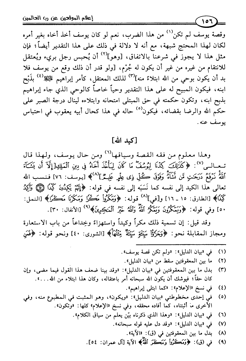 وهذا معلوم من فقه القصة وسياقها (٦) ومن حال يوسف، ولهذا قال تعالى (٧): {كَذَلِكَ كِدْنَا لِيُوسُفَ مَا كَانَ لِيَأخُذَ أَخَاهُ فِي دِينِ الْمَلِكِ [إِلَّا أَنْ يَشَاءَ اللَّهُ نَرْفَعُ دَرَجَاتٍ مَنْ نَشَاءُ وَفَوْقَ كُلِّ ذِي عِلْمٍ عَلِيمٌ] (٨)} [يوسف: ٧٦] فنسب اللَّه تعالى هذا الكيد إلى نفسه كما نَسَبَه إلى نفسه في قوله: {إِنَّهُمْ يَكِيدُونَ كَيْدًا (١٥) وَأَكِيدُ كَيْدًا} [الطارق: ١٥ - ١٦] و [في] (٨) قوله: {وَمَكَرُوا مَكْرًا وَمَكَرْنَا مَكْرًا} [النمل: ٥٠] وفي قوله: {وَيَمْكُرُونَ وَيَمْكُرُ اللَّهُ وَاللَّهُ خَيْرُ الْمَاكِرِينَ} (٩) [الأنفال: ٣٠].