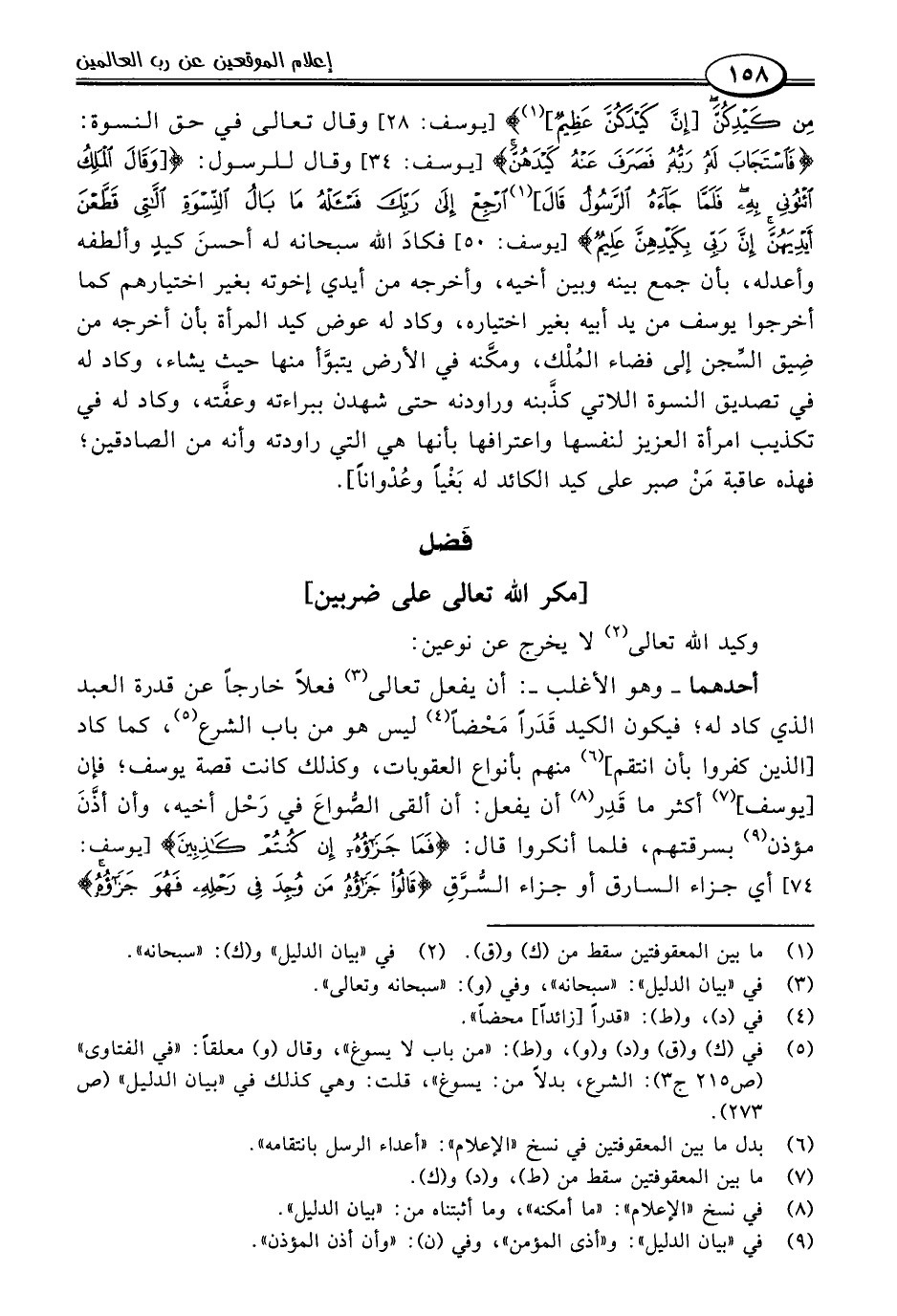 مِنْ كَيْدِكُنَّ [إِنَّ كَيْدَكُنَّ عَظِيمٌ] (١)} [يوسف: ٢٨]، وقال تعالى في حق النسوة: {فَاسْتَجَابَ لَهُ رَبُّهُ فَصَرَفَ عَنْهُ كَيْدَهُنَّ} [يوسف: ٣٤] وقال للرسول: {[وَقَالَ الْمَلِكُ ائْتُونِي بِهِ فَلَمَّا جَاءَهُ الرَّسُولُ قَالَ] (١) ارْجِعْ إِلَى رَبِّكَ فَاسْأَلْهُ مَا بَالُ النِّسْوَةِ اللَّاتِي قَطَّعْنَ أَيْدِيَهُنَّ إِنَّ رَبِّي بِكَيْدِهِنَّ عَلِيمٌ} [يوسف: ٥٠] فكادَ اللَّه سبحانه له أحسنَ كيدٍ وألطفه وأعدله، بأن جمع بينه وبين أخيه، وأخرجه من أيدي إخوته بغير اختيارهم كما أخرجوا يوسف من يد أبيه بغير اختياره، وكاد له عوض كيد المرأة بأن أخرجه من ضِيق السِّجن إلى فضاء المُلْك، ومكَّنه في الأرض يتبوَّأ منها حيث يشاء، وكاد له في تصديق النسوة اللاتي كذَّبنه وراودنه حتى شهدن ببراءته وعفَّته، وكاد له في تكذيب امرأة العزيز لنفسها واعترافها بأنها هي التي راودته وأنه من الصادقين؛ فهذه عاقبة مَنْ صبر على كيد الكائد له بَغْيًا وعُدْوانًا].