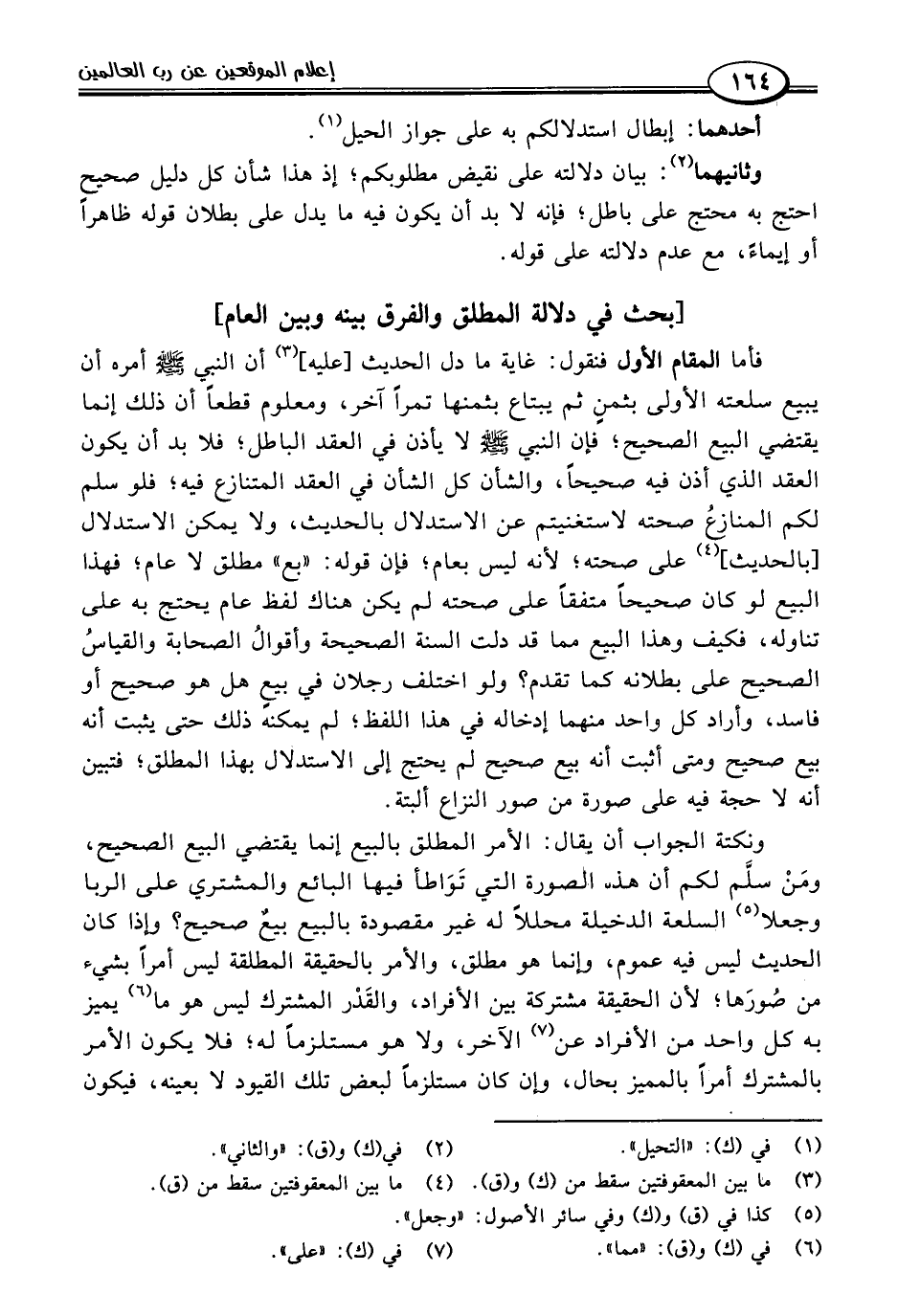 ونكتة الجواب أن يقال: الأمر المطلق بالبيع إنما يقتضي البيع الصحيح، ومَنْ سلَّم لكم أن هذه الصورة التي تَوَاطأ فيها البائع والمشتري على الربا وجعلا (٥) السلعة الدخيلة محللًا له غير مقصودة بالبيع بيعٌ صحيح؟ واذا كان الحديث ليس فيه عموم، وإنما هو مطلق، والأمر بالحقيقة المطلقة لشى أمرًا بشيء من صُورَها؛ لأن الحقيقة مشتركة بين الأفراد، والقَدْر المشترك ليس هو ما (٦) يميز به كل واحد من الأفراد عن (٧) الآخر، ولا هو مستلزمًا له؛ فلا يكون الأمر بالمشترك أمرًا بالمميز بحال، وإن كان مستلزمًا لبعض تلك القيود لا بعينه، فيكون