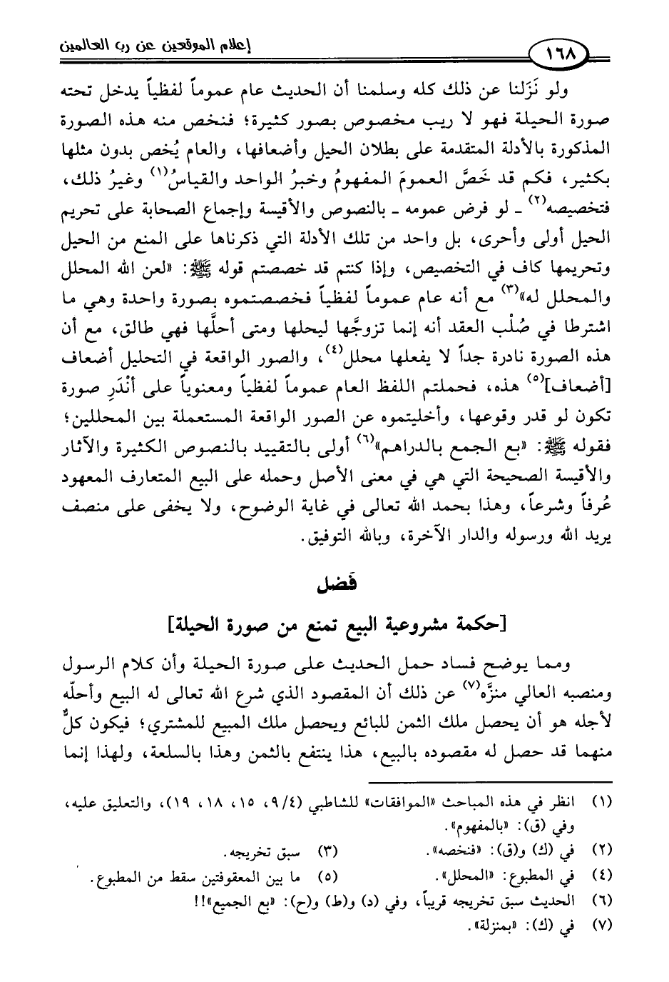 ولو نَزَلنا عن ذلك كله وسلمنا أن الحديث عام عمومًا لفظيًا يدخل تحته صورة الحيلة فهو لا ريب مخصوص بصور كثيرة؛ فنخص منه هذه الصورة المذكورة بالأدلة المتقدمة على بطلان الحيل وأضعافها، والعام يُخص بدون مثلها بكثير، فكم قد خَصَّ العمومَ المفهومُ وخبرُ الواحد والقياسُ (١) وغيرُ ذلك، فتخصيصه (٢) -لو فرض عمومه- بالنصوص والأقيسة وإجماع الصحابة على تحريم الحيل أولى وأحرى، بل واحد من تلك الأدلة التي ذكرناها على المنع من الحيل وتحريمها كاف في التخصيص، وإذا كنتم قد خصصتم قوله -صلى اللَّه عليه وسلم-: "لعن اللَّه المحلل والمحلل له" (٣) مع أنه عام عمومًا لفظيًا فخصصتموه بصورة واحدة وهي ما اشترطا في صُلْب العقد أنه إنما تزوجَّها ليحلها ومتى أحلَّها فهي طالق، مع أن هذه الصورة نادرة جدًا لا يفعلها محلل (٤)، والصور الواقعة في التحليل أضعاف [أضعاف] (٥) هذه، فحملتم اللفظ العام عمومًا لفظيًا ومعنويًا على أنْدَرِ صورة تكون لو قدر وقوعها، وأخليتموه عن الصور الواقعة المستعملة بين المحللين؛ فقوله -صلى اللَّه عليه وسلم-: "بع الجمع بالدراهم" (٦) أولى بالتقييد بالنصوص الكثيرة والآثار والأقيسة الصحيحة التي هي في معنى الأصل وحمله على البيع المتعارف المعهود عُرفًا وشرعًا، وهذا بحمد اللَّه تعالى في غاية الوضوح، ولا يخفى على منصف يريد اللَّه ورسوله والدار الآخرة، وباللَّه التوفيق.