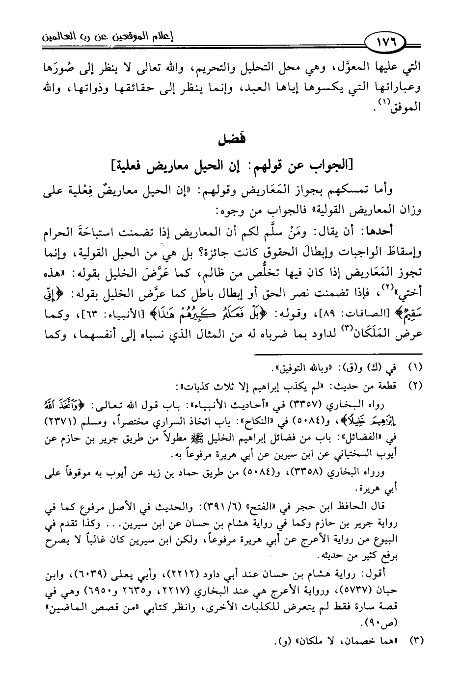 أحدها: أن يقال: ومَنْ سلَّم لكم أن المعاريض إذا تضمنت استباحَةَ الحرام وإسقاطَ الواجبات وإبطالَ الحقوق كانت جائزة؛ بل هي من الحيل القولية، وإنما تجوز المَعَاريض إذا كان فيها تخلُّص من ظالم، كما عَرَّضَ الخليل بقوله: "هذه أختي" (٢)، فإذا تضمنت نصر الحق أو إبطال باطل كما عرَّض الخليل بقوله: {إِنِّي سَقِيمٌ} [الصافات: ٨٩]، وقوله: {بَلْ فَعَلَهُ كَبِيرُهُمْ هَذَا} [الأنبياء: ٦٣]، وكما عرض المَلَكَان (٣) لداود بما ضرباه له من المثال الذي نسباه إلى أنفسهما، وكما