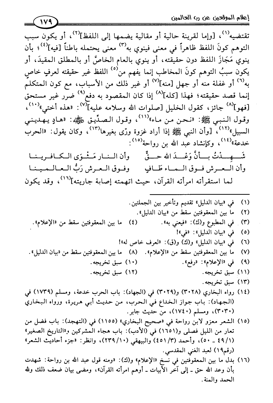 (١٦) بدل ما بين المعقوفتين في نسخ "الإعلام" و (ك): "ومنه قول عبد اللَّه بن رواحة: شهدت بأن وعد اللَّه حق -إلى آخر الأبيات- أوهم امرأته القرآن"، ومضى بيان ضعف ذلك وللَّه الحمد والمنة.