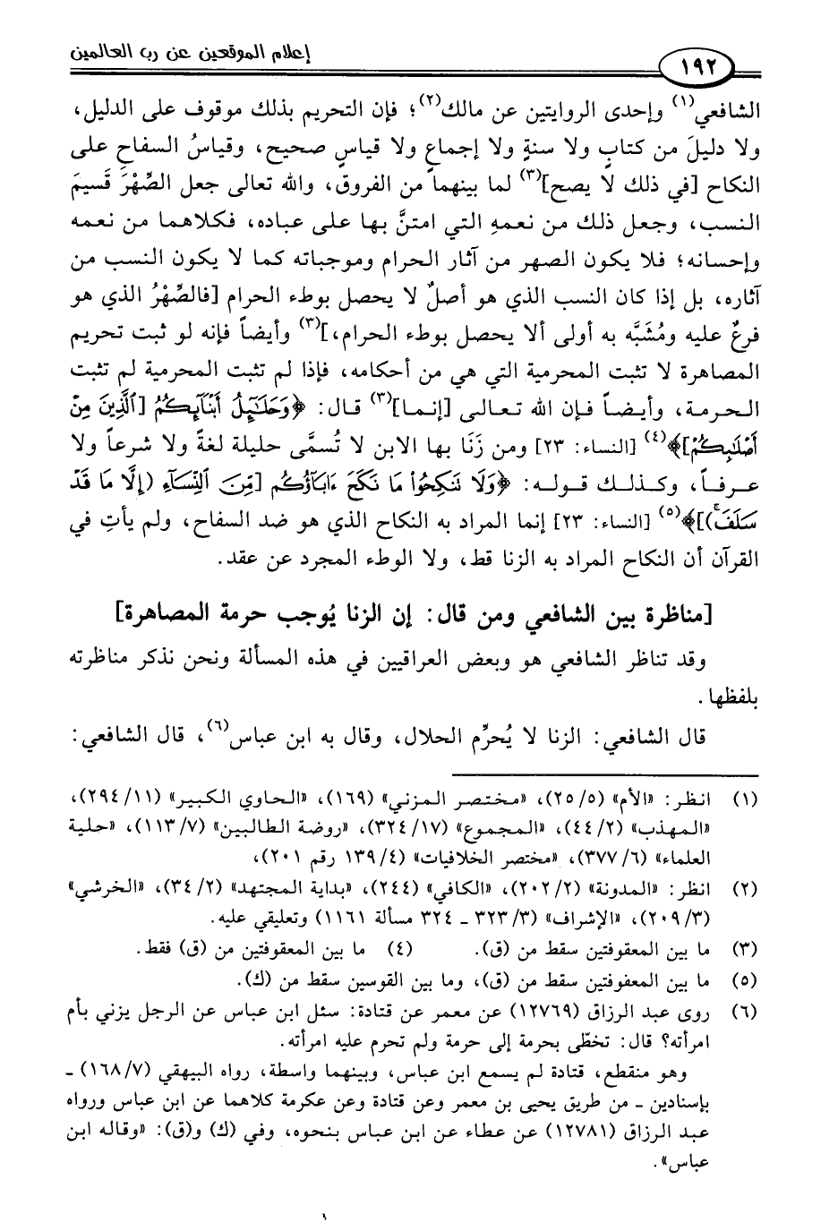 قال الشافعي: الزنا لا يُحرِّم الحلال، وقال به ابن عباس (٦)، قال الشافعي: