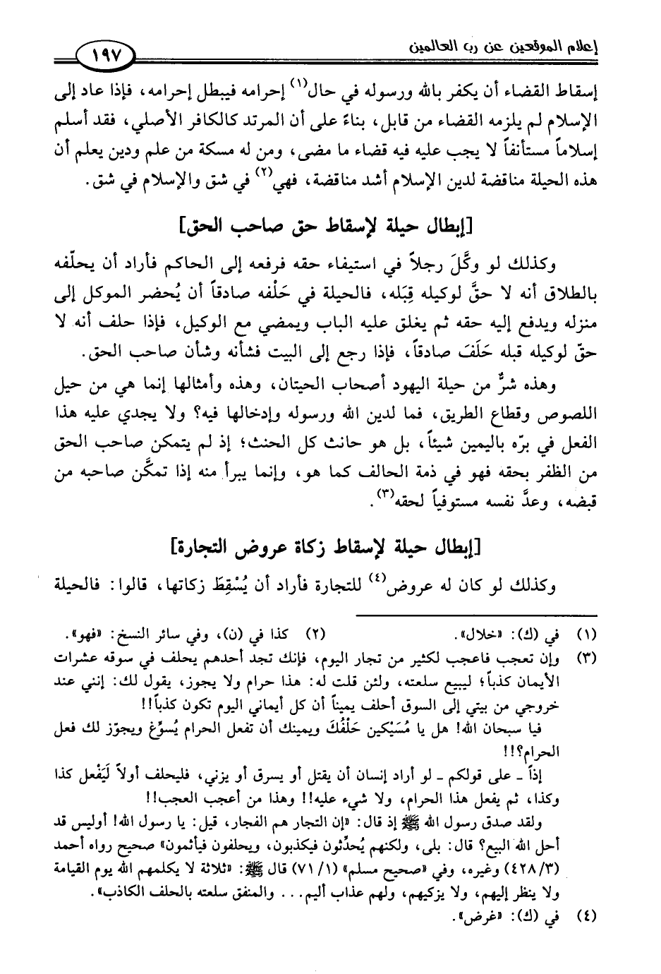 وهذه شرٌّ من حيلة اليهود أصحاب الحيتان، وهذه وأمثالها إنما هي من حيل اللصوص وقطاع الطريق، فما لدين اللَّه ورسوله وإدخالها فيه؟ ولا يجدي عليه هذا الفعل في بره باليمين شيئًا، بل هو حانث كل الحنث؛ إذ لم يتمكن صاحب الحق من الظفر بحقه فهو في ذمة الحالف كما هو، وإنما يبرأ منه إذا تمكَّن صاحبه من قبضه، وعدَّ نفسه مستوفيًا لحقه (٣).