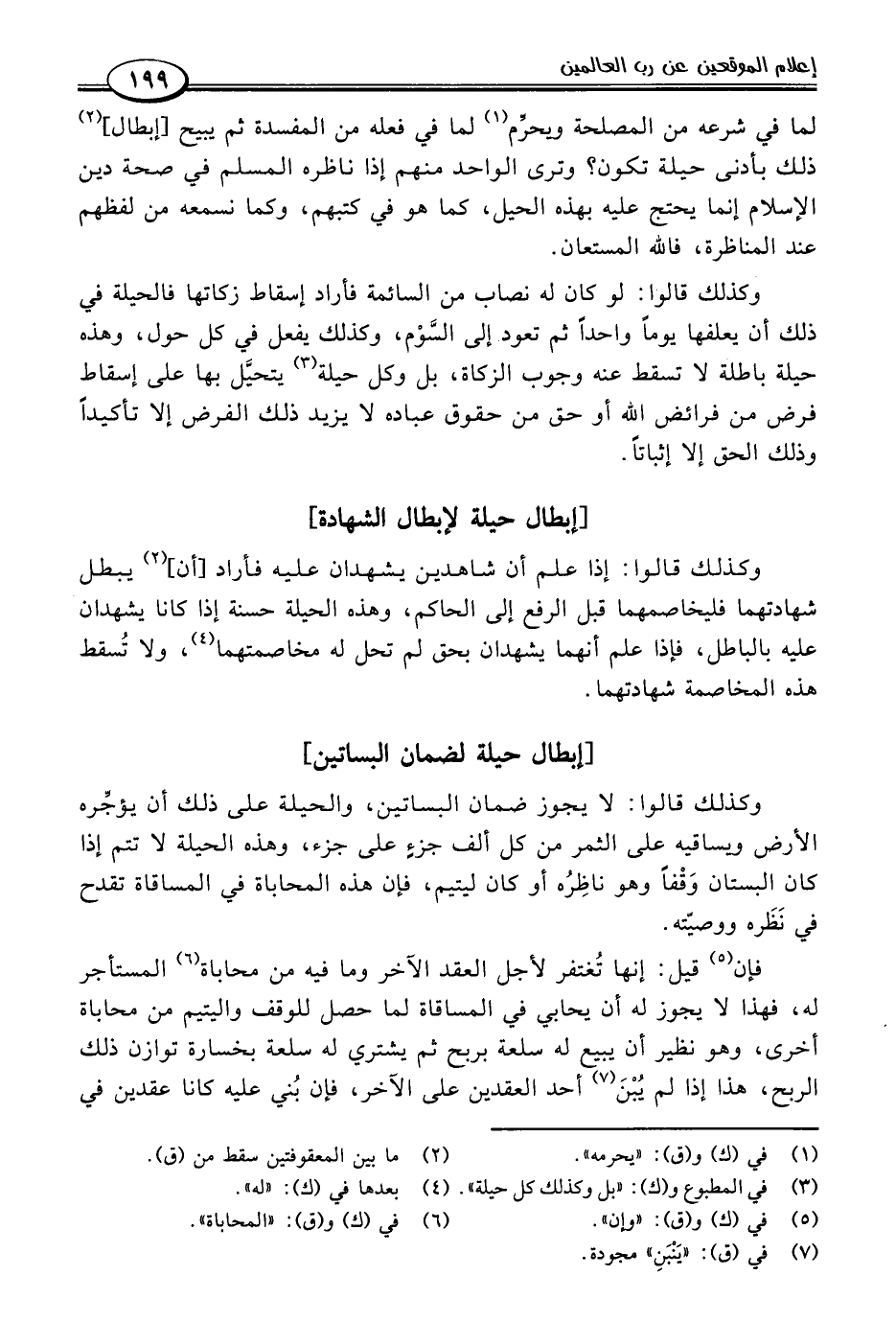 وكذلك قالوا: لو كان له نصاب من السائمة فأراد إسقاط زكاتها فالحيلة في ذلك أن يعلفها يومًا واحدًا ثم تعود إلى السَّوْم، وكذلك يفعل في كل حول، وهذه حيلة باطلة لا تسقط عنه وجوب الزكاة، بل وكل حيلة (٣) يتحيَّل بها على إسقاط فرض من فرائض اللَّه أو حق من حقوق عباده لا يزيد ذلك الفرض إلا تأكيدًا وذلك الحق إلا إثباتًا.