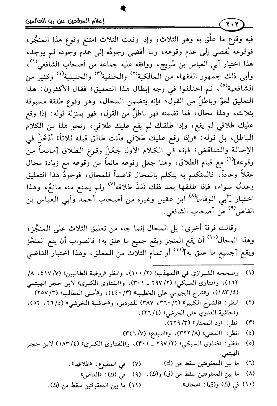 فيه وقوع ما علَّق به وهو الثلاث، وإذا وقعت الثلاث امتنع وقوع هذا المنجَّز، فوقوعه يُفضي إلى عدم وقوعه، وما أفضى وجودُه إلى عدم وجوده لم يوجد، هذا اختيار أبي العباس بن سُريج، ووافقه عليه جماعة من أصحاب الشافعي (١)، وأبى ذلك جمهور الفقهاء من المالكية (٢) والحنفية (٣) والحنبلية (٤) وكثير من الشافعية (٥)، ثم اختلفوا في وجه إبطال هذا التعليق؛ فقال الأكثرون: هذا التعليق لغوٌ وباطلٌ من القول؛ فإنه يتضمن المحال، وهو وقوع طلقة مسبوقة بثلاث، وهذا محال، فما تضمنه فهو باطلٌ من القول، فهو بمنزلة قوله: إذا وقع عليك طلاقي لم يقع، وإذا طلقتك لم يقع عليك طلاقي، ونحو هذا من الكلام الباطل، بل قوله: "وإذا وقع عليك طلاقي فأنت طالق قبله ثلاثًا" أدْخَلُ في الإحالة والتناقض؛ فإنه في الكلام الأول جَعَلَ وقوع الطلاق [مانعًا من وقوعه] (٦) مع قيام الطلاق، وهنا جعل وقوعه مانعًا من وقوعه مع زيادة محال عقلًا وعادةً، فالمتكلم به يتكلم بالمحال قاصدًا للمحال، فوجودُ هذا التعليق وعدمُه سواء، فإذا طلقها بعد ذلك نَفذَ طلاقه (٧) ولم يمنع منه مانعٌ، وهذا اختيار [أبي الوفاء] (٨) ابن عقيل وغيره من أصحاب أحمد وأبي العباس بن القاص (٩) من أصحاب الشافعي.