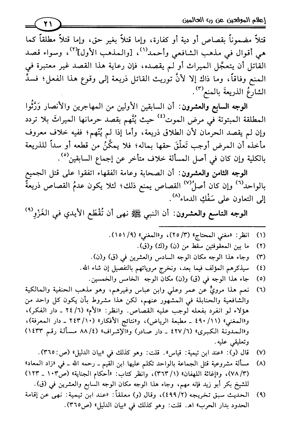 (٨) مسألة مشروعية قتل الجماعة بالواحد تكلم عليها ابن القيم -رحمه اللَّه- في "زاد المعاد" (٣/ ٧٨)، و"إغاثة اللهفان" (١/ ٣٦٣)، وانظر كتاب: "أحكام الجناية" (ص ١٠٣ - ١٢٣) للشيخ بكر أبو زيد فإنه مهم، وجاء هذا الوجه مكان الوجه السابع والعشرين في (ق).