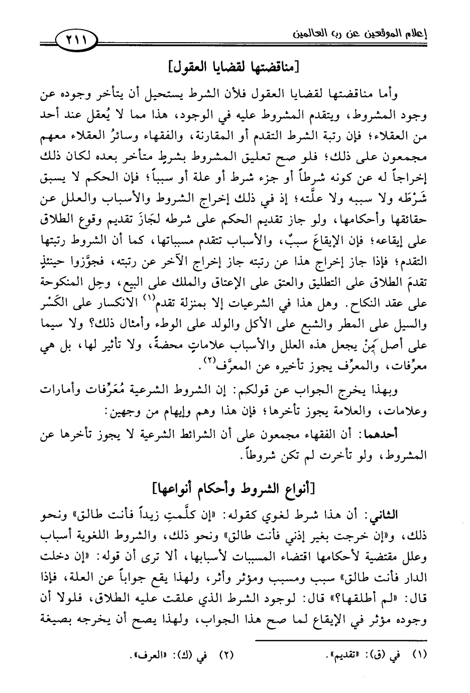وأما مناقضتها لقضايا العقول فلأن الشرط يستحيل أن يتأخر وجوده عن وجود المشروط، ويتقدم المشروط عليه في الوجود، هذا مما لا يُعقل عند أحد من العقلاء؛ فإن رتبة الشرط التقدم أو المقارنة، والفقهاء وسائرُ العقلاء معهم مجمعون على ذلك؛ فلو صح تعليق المشروط بشرطٍ متأخر بعده لكان ذلك إخراجًا له عن كونه شرطًا أو جزء شرط أو علة أو سببًا؛ فإن الحكم لا يسبق شَرْطَه ولا سببه ولا علَّته؛ إذ في ذلك إخراج الشروط والأسباب والعلل عن حقائقها وأحكامها، ولو جاز تقديم الحكم على شرطه لجَازَ تقديم وقوع الطلاق على إيقاعه؛ فإن الإيقاعَ سبب، والأسباب تتقدم مسبباتها، كما أن الشروط رتبتها التقدم؛ فإذا جاز إخراج هذا عن رتبته جاز إخراج الآخر عن رتبته، فجوَّزوا حينئذٍ تقدمَ الطلاق على التطليق والعتق على الإعتاق والملك على البيع، وحِل المنكوحة على عقد النكاح. وهل هذا في الشرعيات إلا بمنزلة تقدم (١) الانكسار على الكَسْر والسيل على المطر والشبع على الأكل والولد على الوطء وأمثال ذلك؟ ولا سيما على أصل منْ يجعل هذه العلل والأسباب علاماتٍ محضةً، ولا تأثير لها، بل هي معرِّفات، والمعرِّف يجوز تأخيره عن المعرَّف (٢).