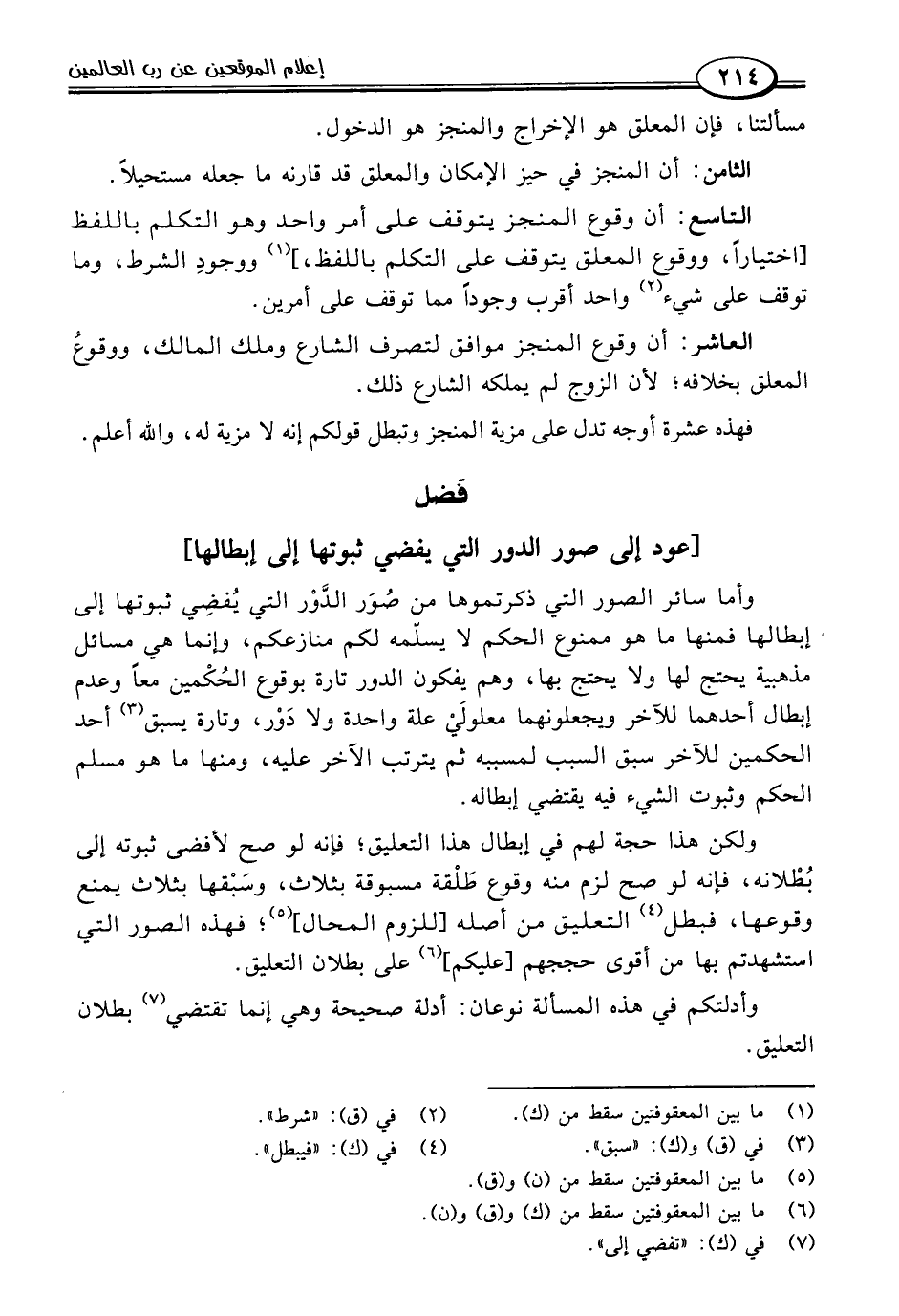 وأما سائر الصور التي ذكرتموها من صُوَر الدَّوْر التي يُفضِي ثبوتها إلى إبطالها فمنها ما هو ممنوع الحكم لا يسلّمه لكم منازعكم، وإنما هي مسائل مذهبية يحتج لها ولا يحتج بها، وهم يفكون الدور تارة بوقوع الحُكْمين معًا وعدم إبطال أحدهما للآخر ويجعلونهما معلولَيْ علة واحدة ولا دَوْر، وتارة يسبق (٣) أحد الحكمين للآخر سبق السبب لمسببه ثم يترتب الآخر عليه، ومنها ما هو مسلم الحكم وثبوت الشيء فيه يقتضي إبطاله.