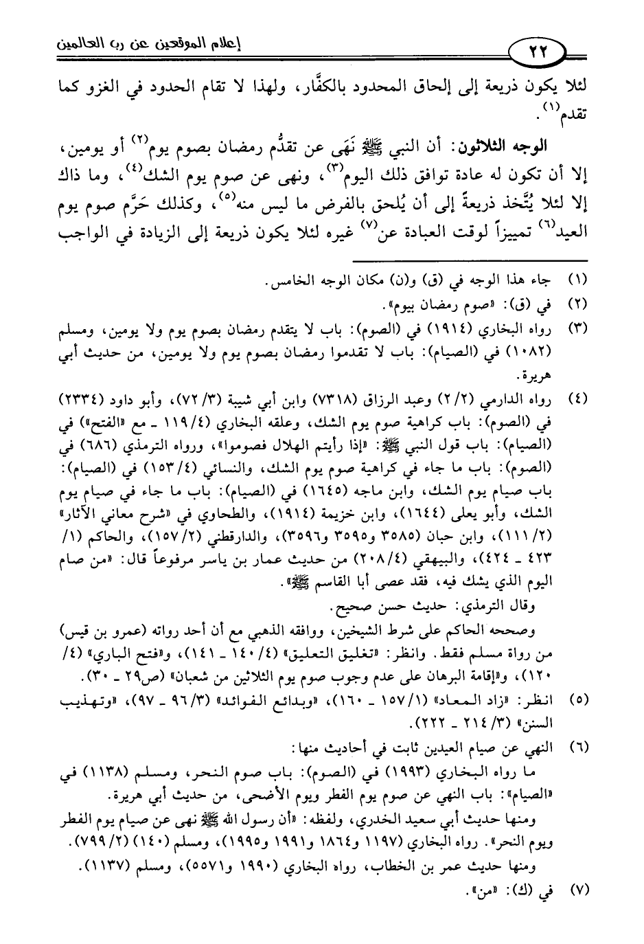 الوجه الثلاثون: أن النبي -صلى اللَّه عليه وسلم- نَهَى عن تقدُّم رمضان بصوم يوم (٢) أو يومين، إلا أن تكون له عادة توافق ذلك اليوم (٣)، ونهى عن صوم يوم الشك (٤)، وما ذاك إلا لئلا يُتَّخذ ذريعةَ إلى أن يُلحق بالفرض ما ليس منه (٥)، وكذلك حرَّم صوم يوم العيد (٦) تمييزًا لوقت العبادة عن (٧) غيره لئلا يكون ذريعة إلى الزيادة في الواجب